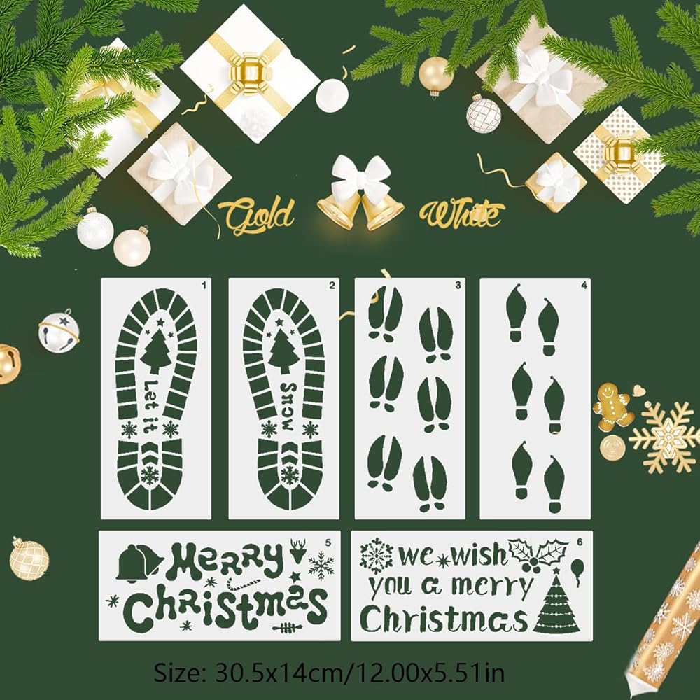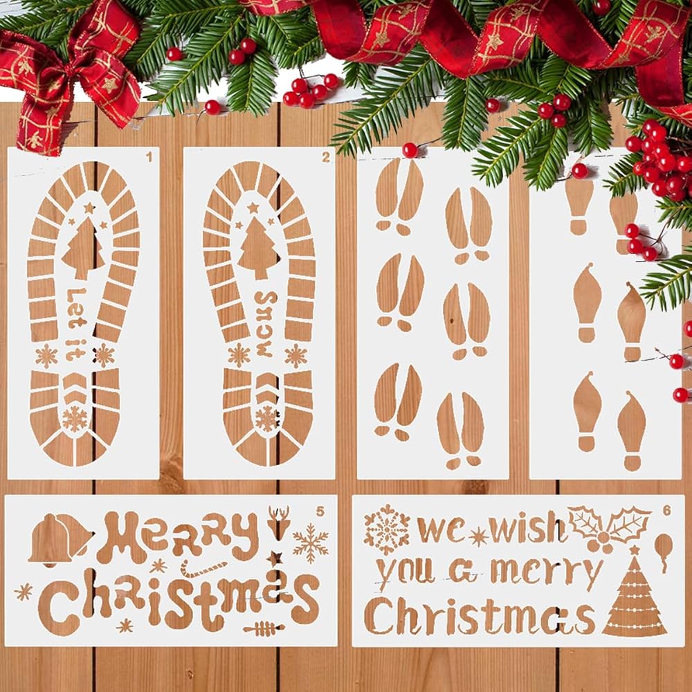 6 قطع استنسل قدم عيد الميلاد أرضية كبيرة سانتا بصمة ندفة الثلج قزم شجرة عيد الميلاد مجوفة قالب رسم قابل لإعادة الاستخدام للرسم على علامة خشبية نافذة جدار أرضية ديكورات يدوية ذاتية الصنع