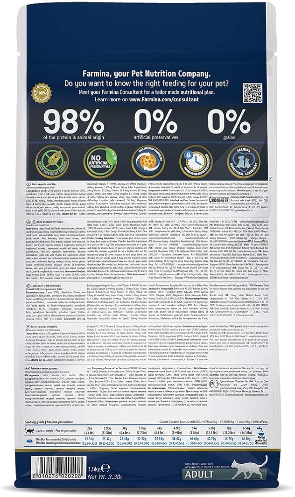 تم تصميم وصفة لحم الضأن الخالية من الحبوب من Farmina N&D لتلبية المستويات الغذائية التي حددتها AAFCO للملفات الغذائية للقطط لجميع مراحل الحياة.