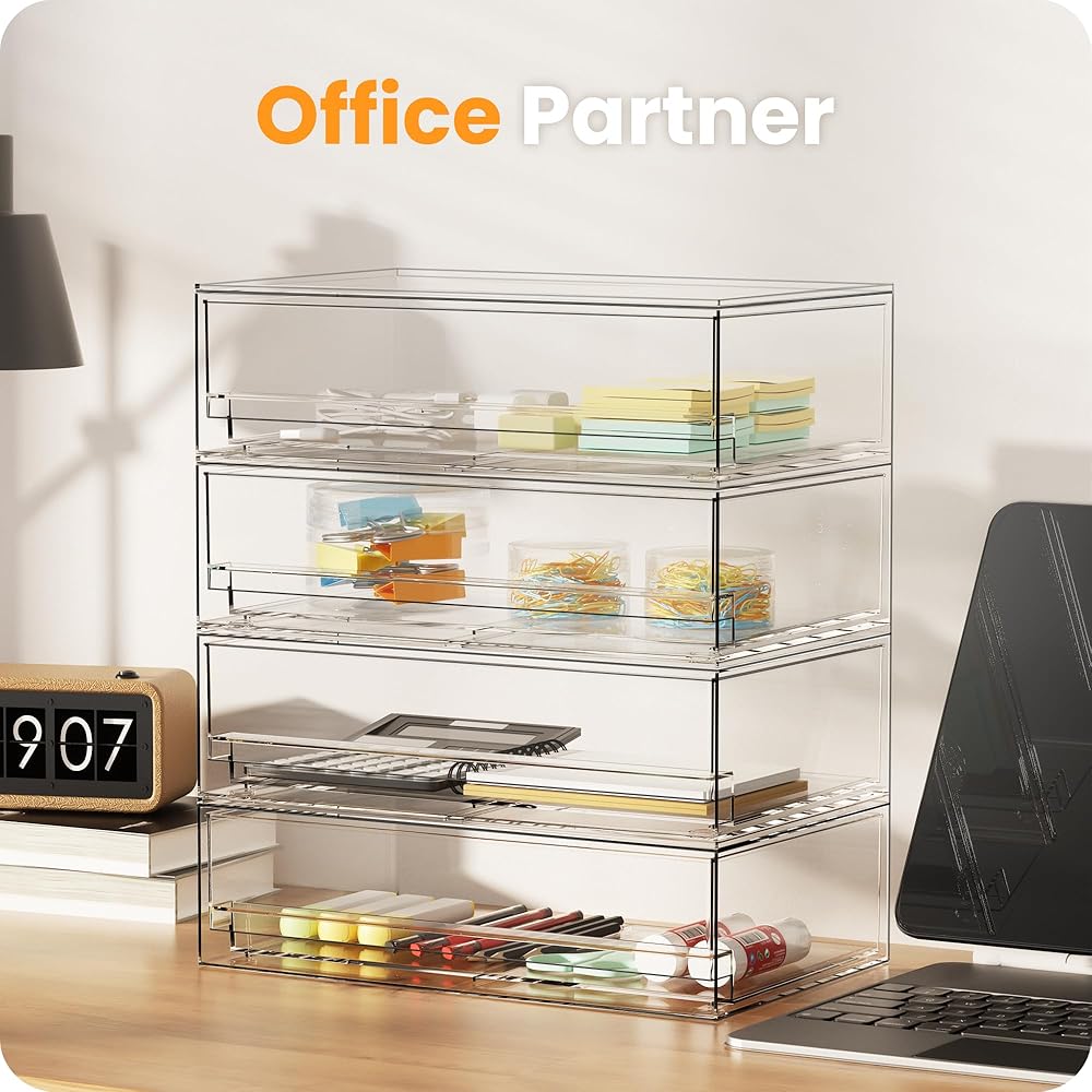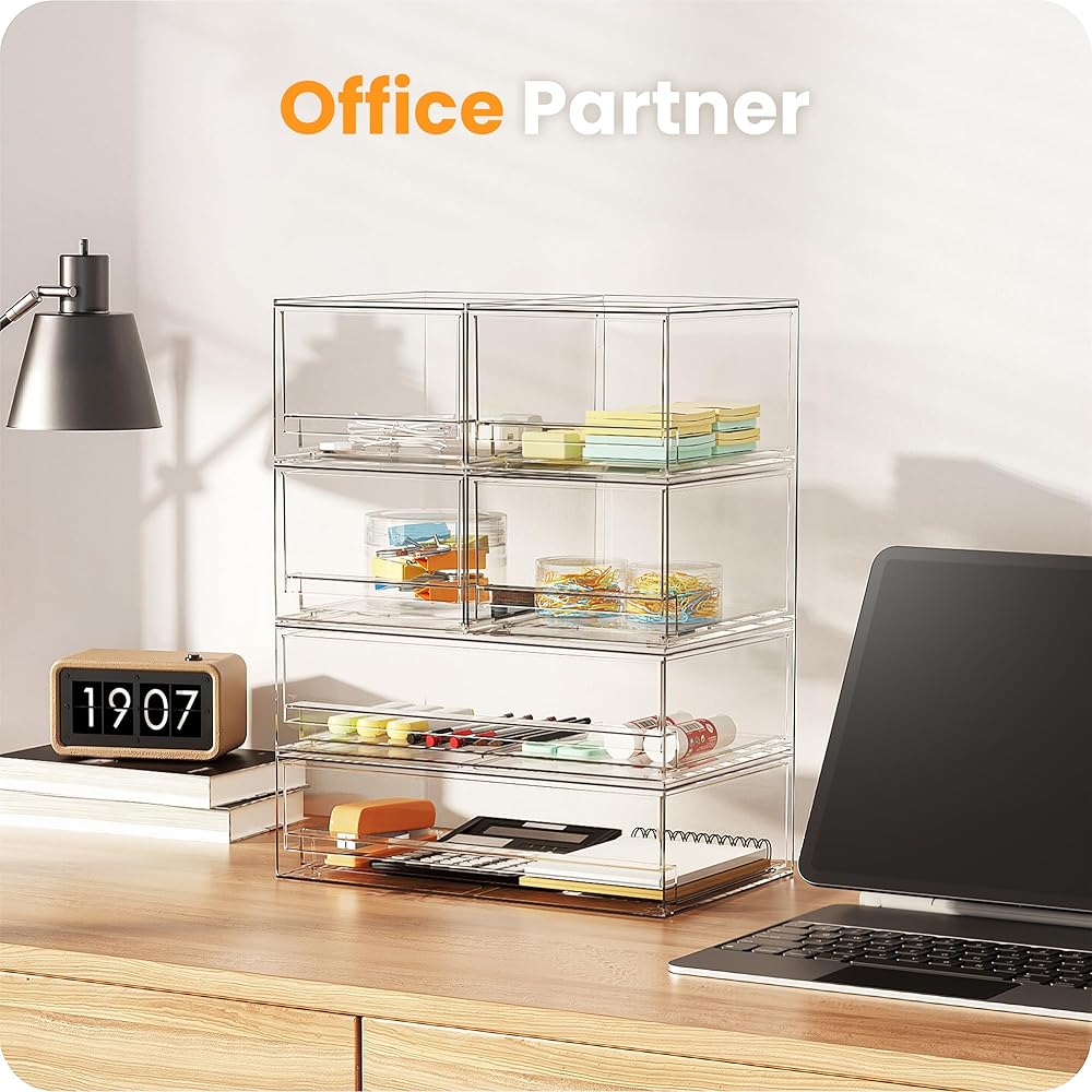 [تصميم قابل للتكديس] يأتي مع منظمي تخزين بدرجين، يبلغ مقاس كل منظم 19.05 سم عمقًا × 30.48 سم عرضًا × 8.89 سم ارتفاعًا. حاويات التخزين قابلة للتكديس، والتخزين الرأسي سيوفر الكثير من المساحة. يمكنك أيضًا استخدامها جنبًا إلى جنب. ضع أغراضك الصغيرة فوق صناديق الأكريليك لتجعل مساحة سطح العمل الخاص بك أكثر ترتيبًا.