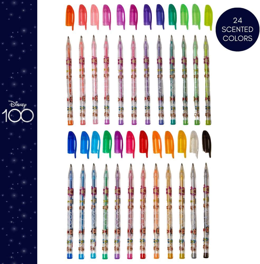 SCENTED GEL & GLITTER GEL PENS – Each set comes with 12 colored glitter gel pens and 12 regular and metallic gel pens with removable caps, all in rainbow colors. Each scented pen has its own unique yummy smell! It comes in a clear plastic case with a bar to line up each individual pen for easy storage, travel and organization.