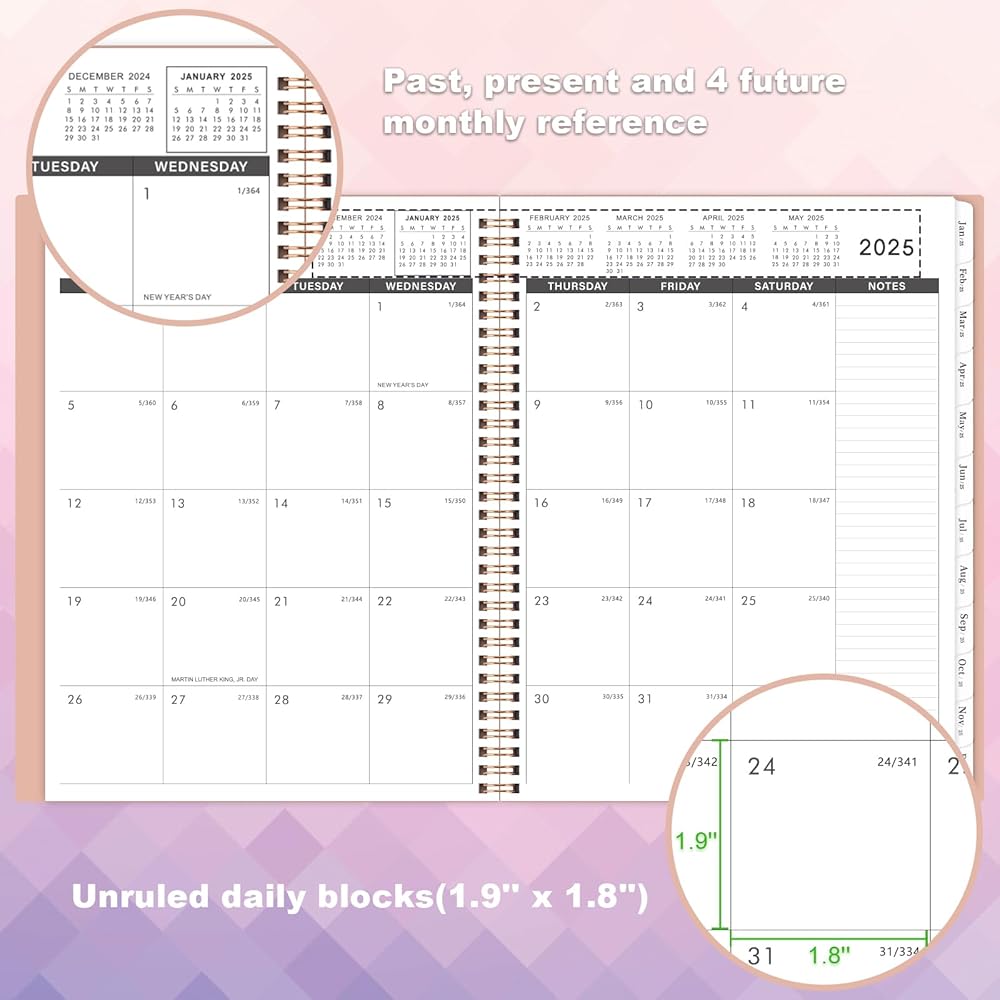 🌷مخطط شهري 2025 - يغطي المخطط الشهري 2025 12 شهرًا من يناير 2025 إلى ديسمبر 2025، ويضم 12 شهرًا من الصفحات الشهرية مع تواريخ جوليان والعطلات المميزة. حجم المخطط الشهري هو 9 × 11 بوصة، وتوفر المكعبات اليومية مقاس 1.8 × 1.9 بوصة مساحة واسعة لتخطيطك اليومي.