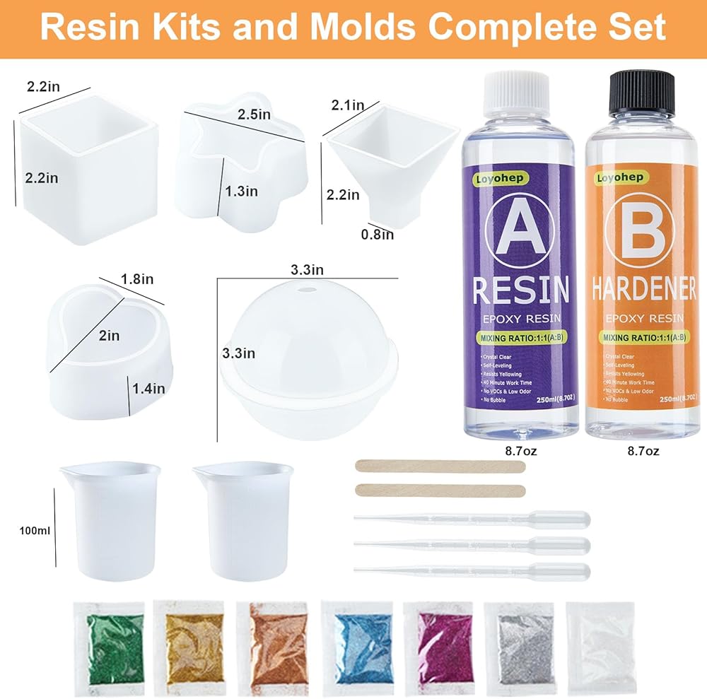 • مجموعة المبتدئين لقوالب راتنجات الإيبوكسي الكل في واحد: مجموعة كاملة من مجموعات وقوالب راتنجات الإيبوكسي LOYOHEP، تتميز بـ 17.4 أونصة من راتنجات الإيبوكسي الفاخر، و5 قوالب سيليكون راتينج لطيفة، ومجموعة لامعة مبهرة من 7 ألوان، وأدوات أساسية مثل أكواب القياس، العصي الخشبية، والقطارات