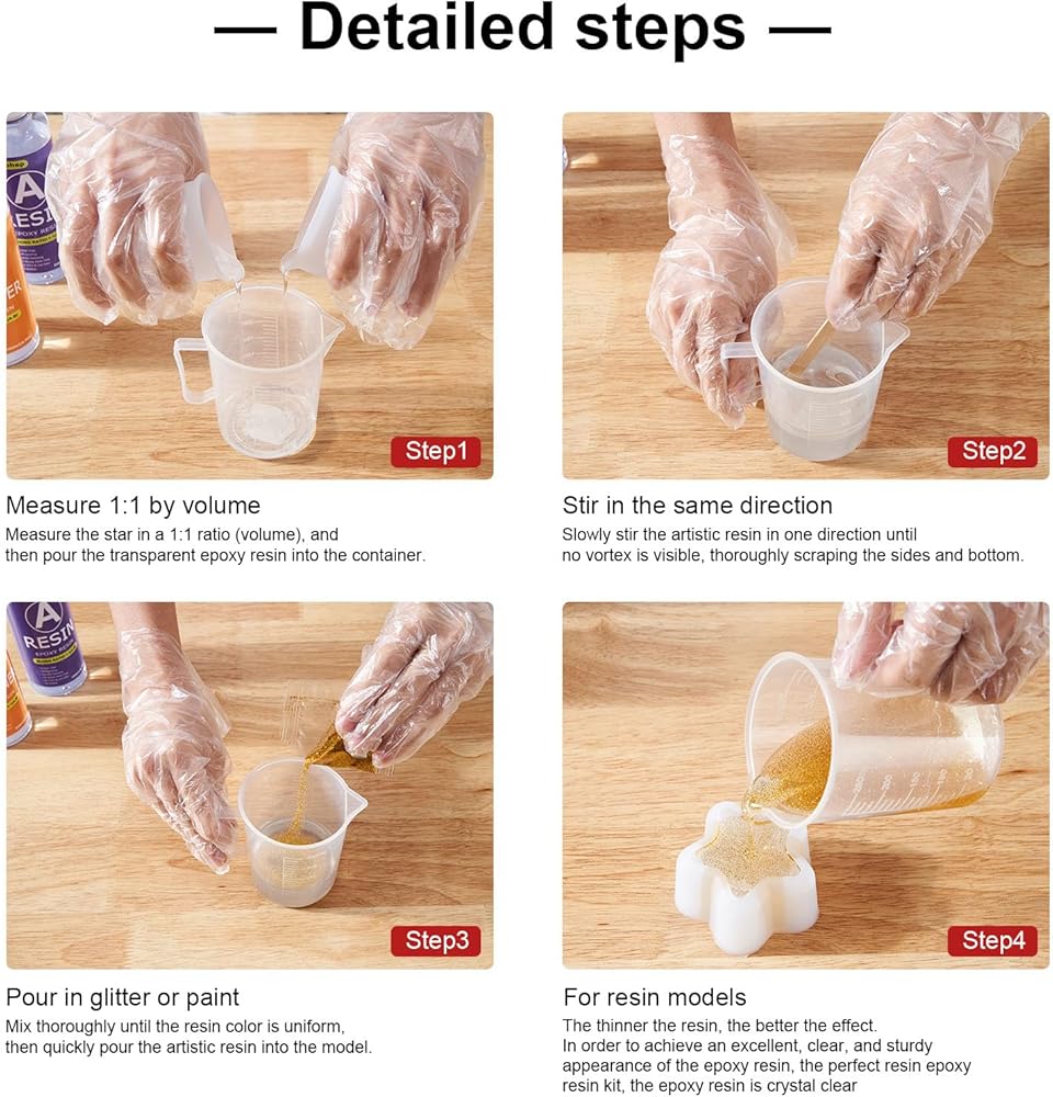 • راتنجات الإيبوكسي عالية الجودة: تتضمن مجموعة راتنجات الإيبوكسي 17.4 أونصة من راتنجات الإيبوكسي المصممة خصيصًا، والتي تشتمل على جزء من الراتنج بوزن 8.7 أونصة وجزء مقوى بوزن 8.7 أونصة. مع مزيج بسيط بنسبة حجم 1:1، يخلق تفريغًا ذاتيًا للغاز، وإزالة الرغوة الذاتية، ولمعانًا عاليًا، ومضادًا للخدش، ومقاومًا للطلاء الأصفر. وعادةً ما يستغرق العلاج من 8 إلى 24 ساعة في الصيف وأطول في الشتاء. عند استخدام الراتينج في الشتاء، يرجى تسخين الراتينج عن طريق حمام مائي أولاً والحفاظ على سطح العمل دافئًا تمامًا