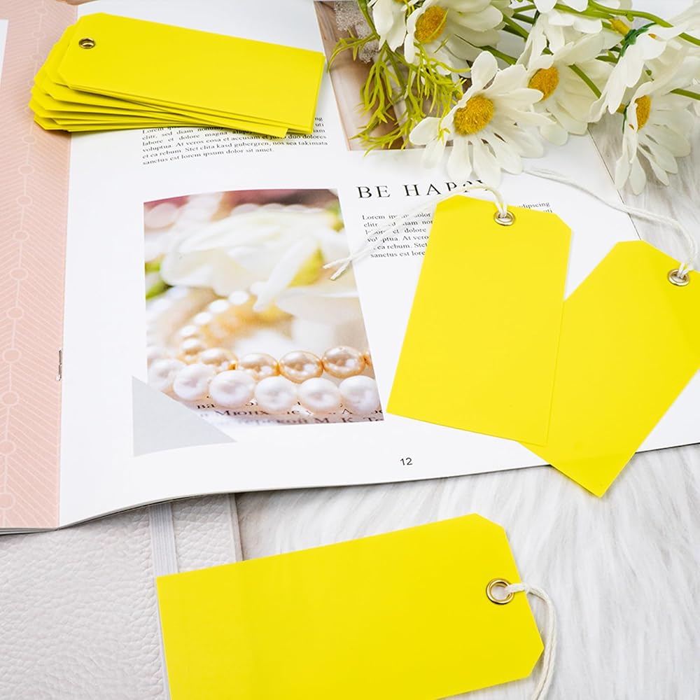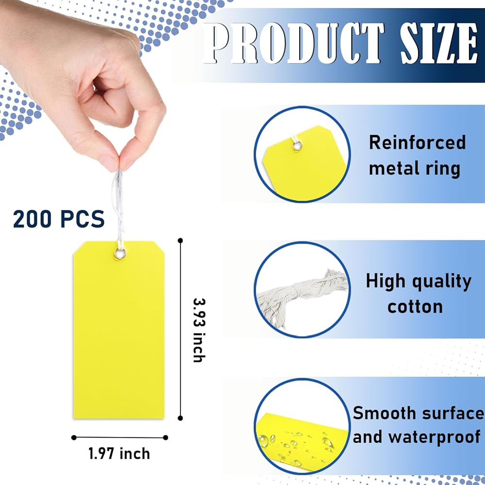 Appropriate Size for Use: The yellow tabs are the appropriate size, measuring approximately 1.97 x 3.93 inches / 5 x 10cm, with a cord length of approximately 11.81 inches / 30 cm. The yellow tabs come with reinforced holes and cords for easy carrying and use.