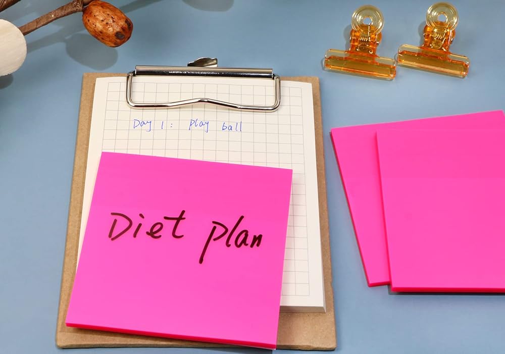 One package include 4 packs of clear Sticky Notes,50 sheets per pack.The total number is 200 sheets.The size of the paper is 7.6x7.6cm/2.99x2.99inch.These stickies are see through, the text on the page is clearly readable so they are perfect for marking documents for signing etc. Using them for page markers in assorted work books and they work great. You can easily peel them off and re-stick them without marking up a page. Assorted colors, all see through and when you pull one out, the next pops up nicely. Great little sticky notes. They are transparent and can work like a removable highlighter. They can also be written on. Will stick to paper and other surfaces. Easy to remove without damage. Perfect for when you want to make notes in a borrowed book- these let you do it and remove them before you return the book.