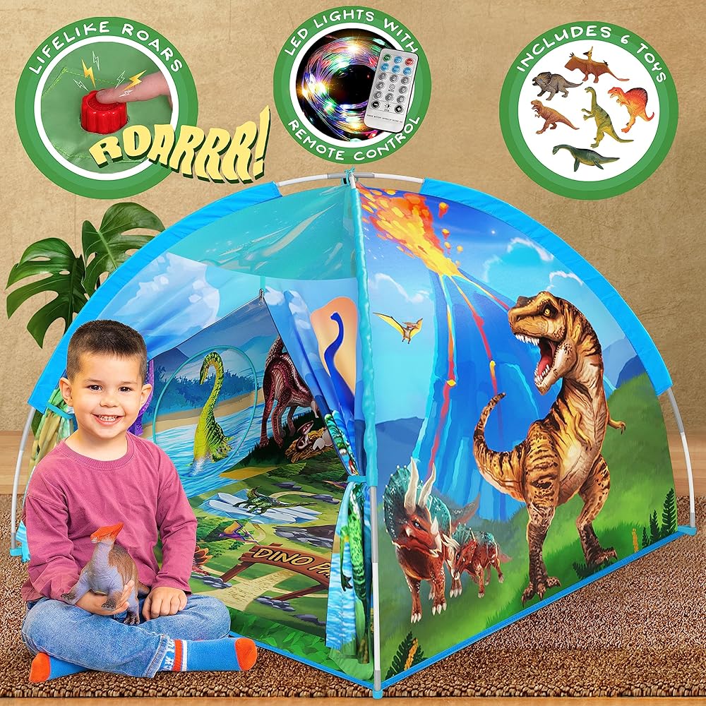 🦕 . 𝐁𝐞𝐬𝐭 𝐟𝐨𝐫 𝐭𝐡𝐞𝐢𝐫 𝐊𝐢𝐝𝐬 - استمتع بخيمة اللعب سهلة التركيب والتنظيف لسنوات قادمة. قم بتعليم أطفالك الصغار عن الديناصورات التي يمكنهم رؤيتها وسماعها باستخدام كتيب دينو ديسكفري الإلكتروني، والألعاب المتضمنة في خيمة الأطفال هذه.