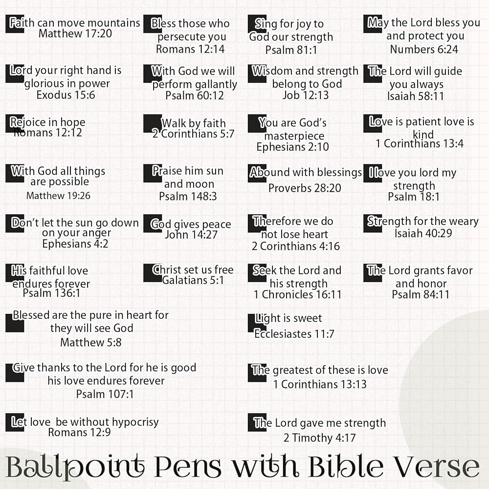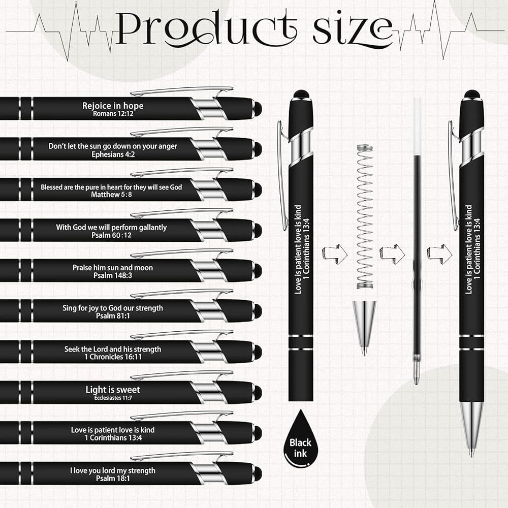 • الحجم المناسب: كل قلم حبر جاف بآية من الكتاب المقدس يبلغ طوله تقريبًا. 14.5 سم/ 5.71 بوصة، حجمها المحمول لن يأخذ مساحة كبيرة، يمكنك وضعها في حقيبتك، ويمكنك حملها إلى أماكن أخرى بسهولة، وسوف تجلب لك الراحة في الاستخدام