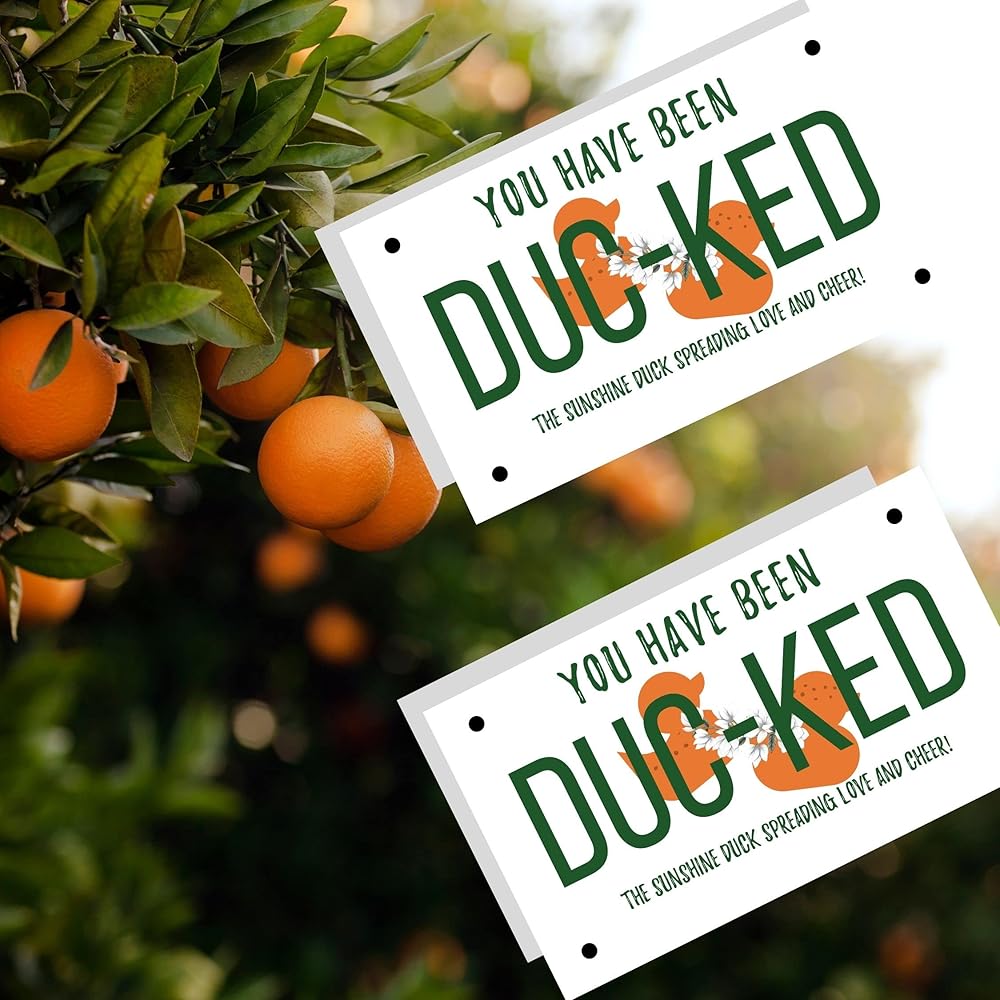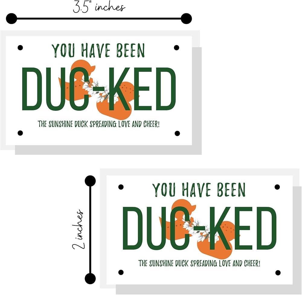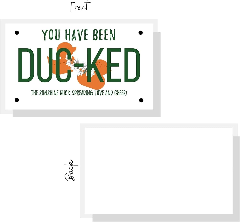 • Design is a white card with orange duck that looks like a license plate.