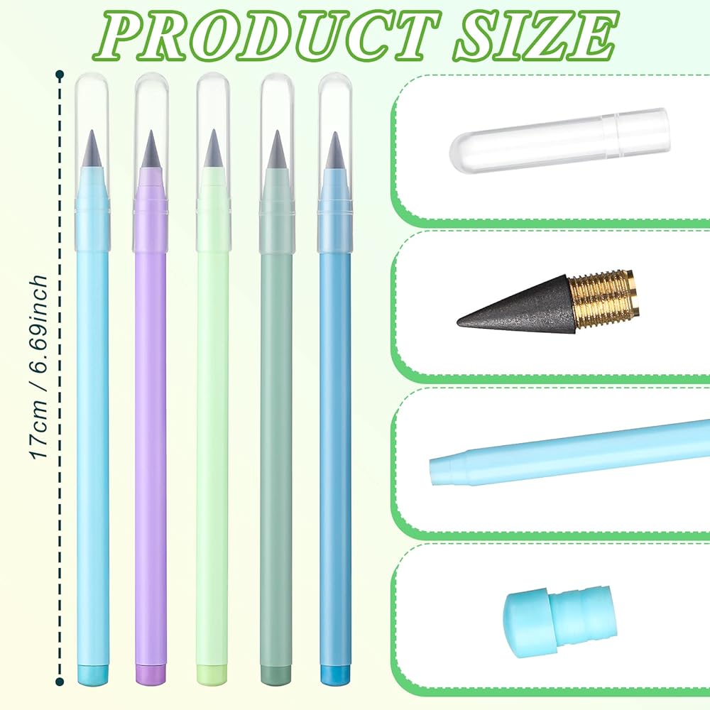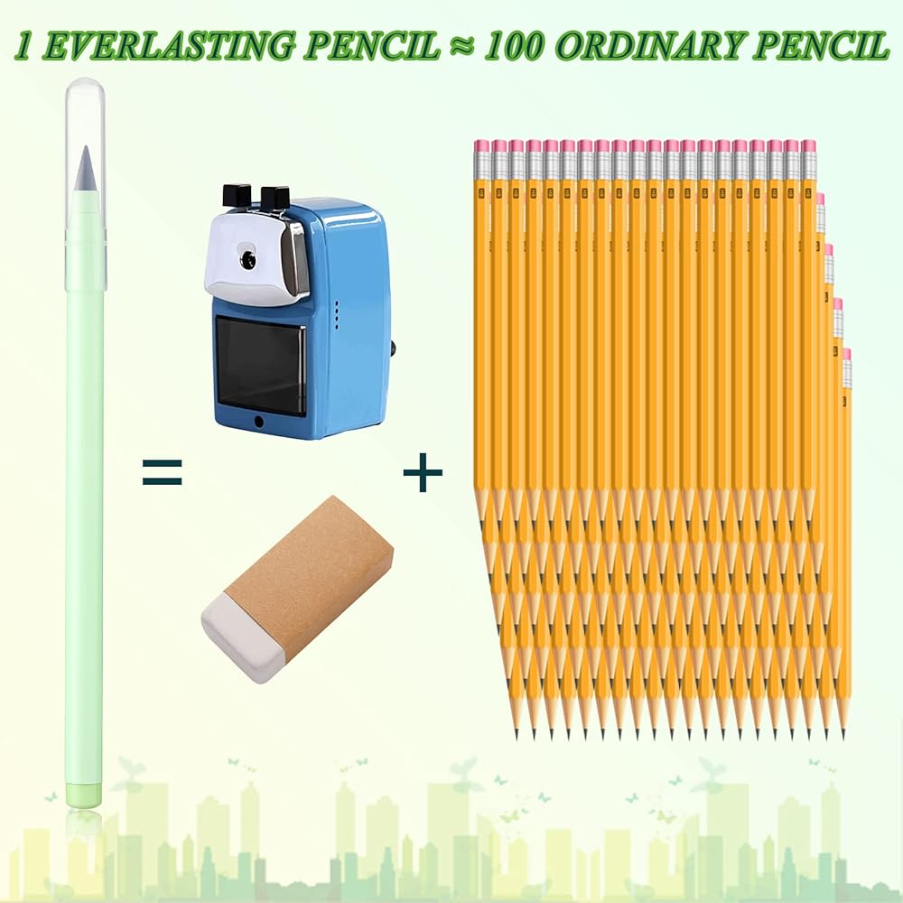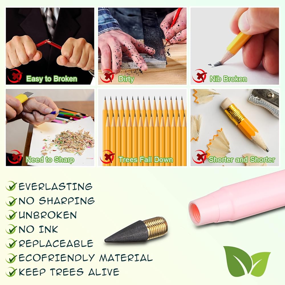 • Feature Inkless Design: different from common pencils, our eternal pencils adopt graphite material, same handwriting as ordinary pencils, easy to erase, however, they can dramatically reduce sharpening and inking time, do not break easily when writing and will not get your hands dirty, convenient than traditional pencils, good helpers for office and study