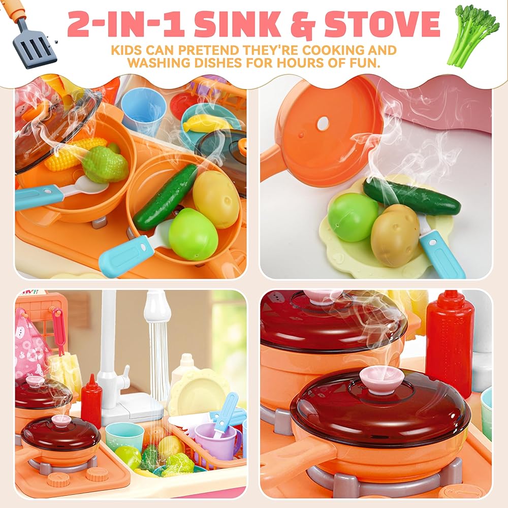 مجموعة لعب المطبخ 2 في 1: مجموعة حوض اللعب التفاعلية للمطبخ تأتي مع موقد يضيء ويصدر أصوات طهي واقعية، مما يوفر تجربة طهي غامرة للأطفال. بالإضافة إلى ذلك، يمكن لتصميم الصنبور الكهربائي ضخ المياه بسلاسة، مما يسمح لأطفالك باستخدام المياه المتدفقة لغسل لعبة الطعام وأدوات المطبخ في لعبة الحوض.