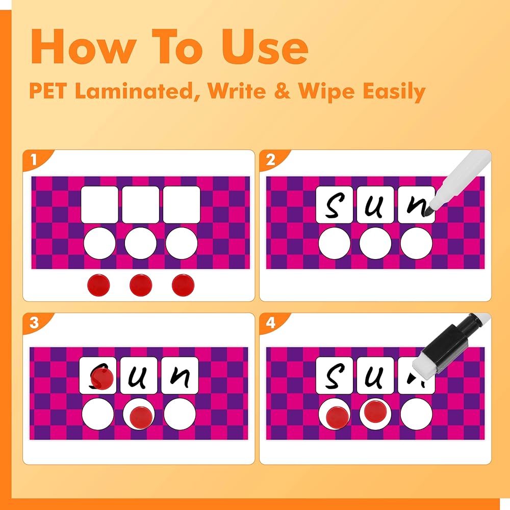 4 مستويات مختلفة: تنقسم البطاقات إلى 4 مستويات، كلمتين صوتيتين إلى 5 كلمات صوتية. يمكن للأطفال إدخال شريحة صغيرة في كل صندوق صوت لتمثيل كل عنصر صوتي يسمعونه، وهو مناسب للمبتدئين في البيئات الفردية أو الجماعية لزيادة الوعي الصوتي.