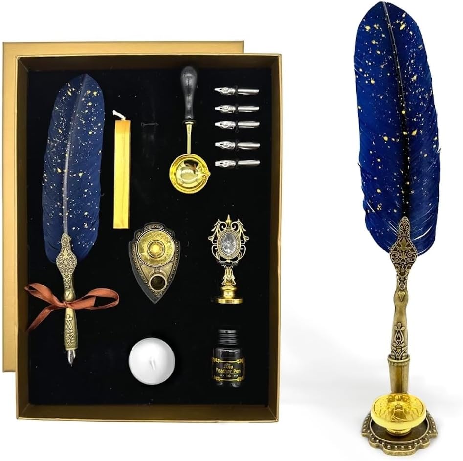 مجموعة أقلام وحبر ريش من FTC - قلم حبر غمس للخط العتيق مع سن بديلة، قاعدة حامل القلم، 12 ختم شمع زودياك، ختم، مغلفات، ورق رسائل، هدية فنية (أزرق)