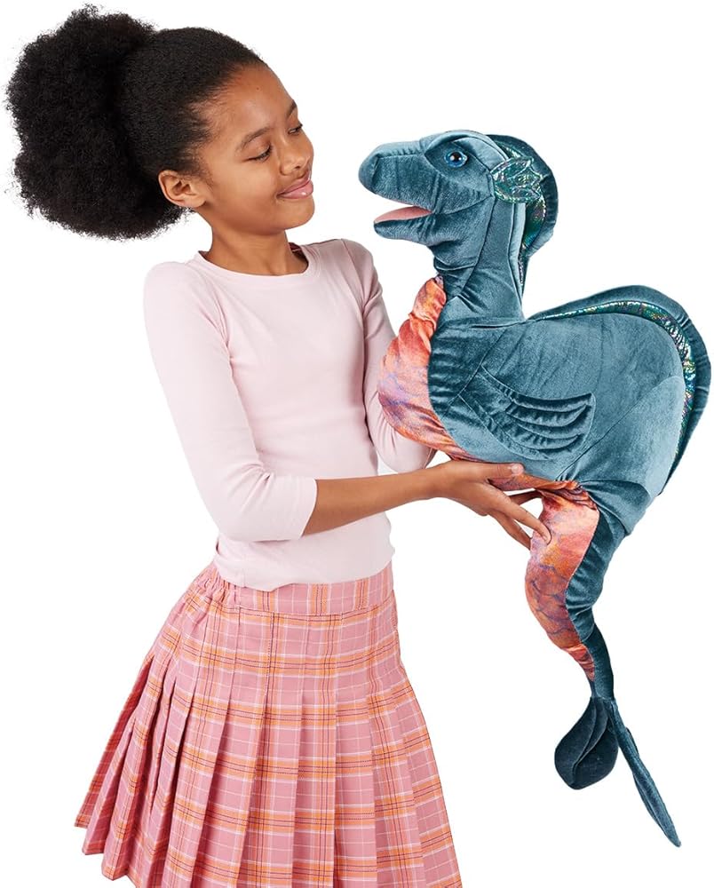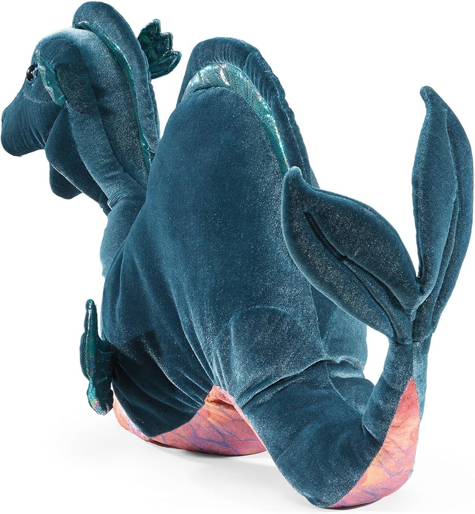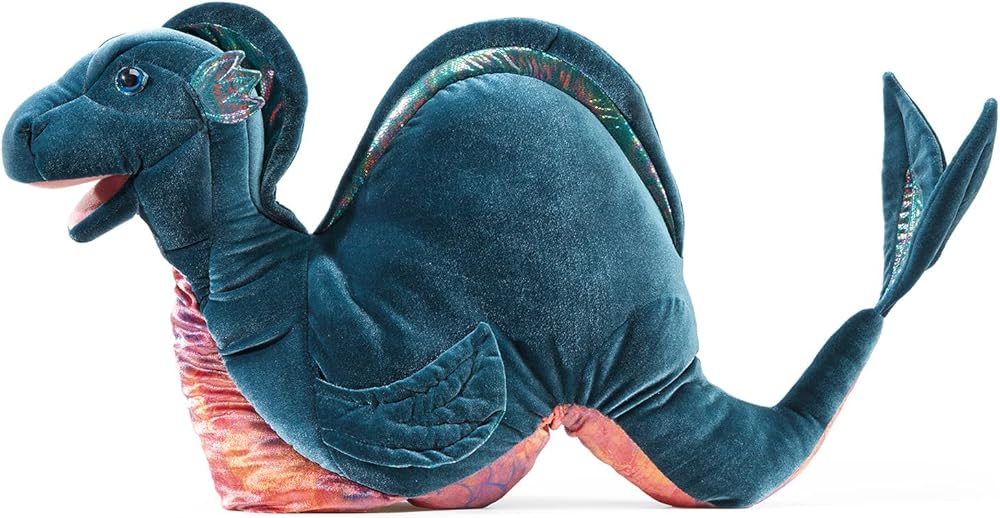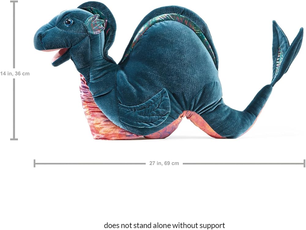 From the depths of imagination comes the whimsical Nessie puppet, legendary creature of Loch Ness. A sizable beast of mythical proportions in teal stretch velour plush with shimmering iridescent metallic accents, a long tail, and movable mouth on a friendly visage. It appears no mystery that this spectacular puppet is indeed armfuls of fun! This puppet measures 32 x 7 x 14 inches (LxWxH).Since 1976, Folkmanis has been encouraging young imaginations to blossom with its innovative and engaging specialty puppets, promoting creativity and discovery while winning nearly every industry, child development, and kid-tested award. Folkmanis has grown to become the premier manufacturer of plush puppets worldwide, offering over 200 of the most heartwarming and realistically designed creatures--both exotic and familiar--on the market today. (Birthday: July 2024)