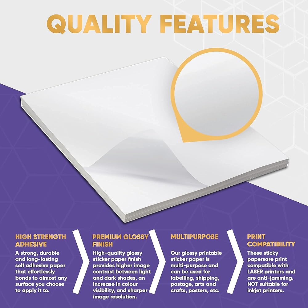 متوافق مع الليزر فقط: ورق الملصقات اللامع الخاص بنا مناسب لطابعات الليزر فقط. يقلل ورق الملصقات اللامع القابل للطباعة من غطاء التقطيع الذي يحدث من طابعات الليزر. سيسمح لك ذلك بتحقيق نتائج الألوان الدقيقة والنابضة بالحياة التي تبحث عنها.