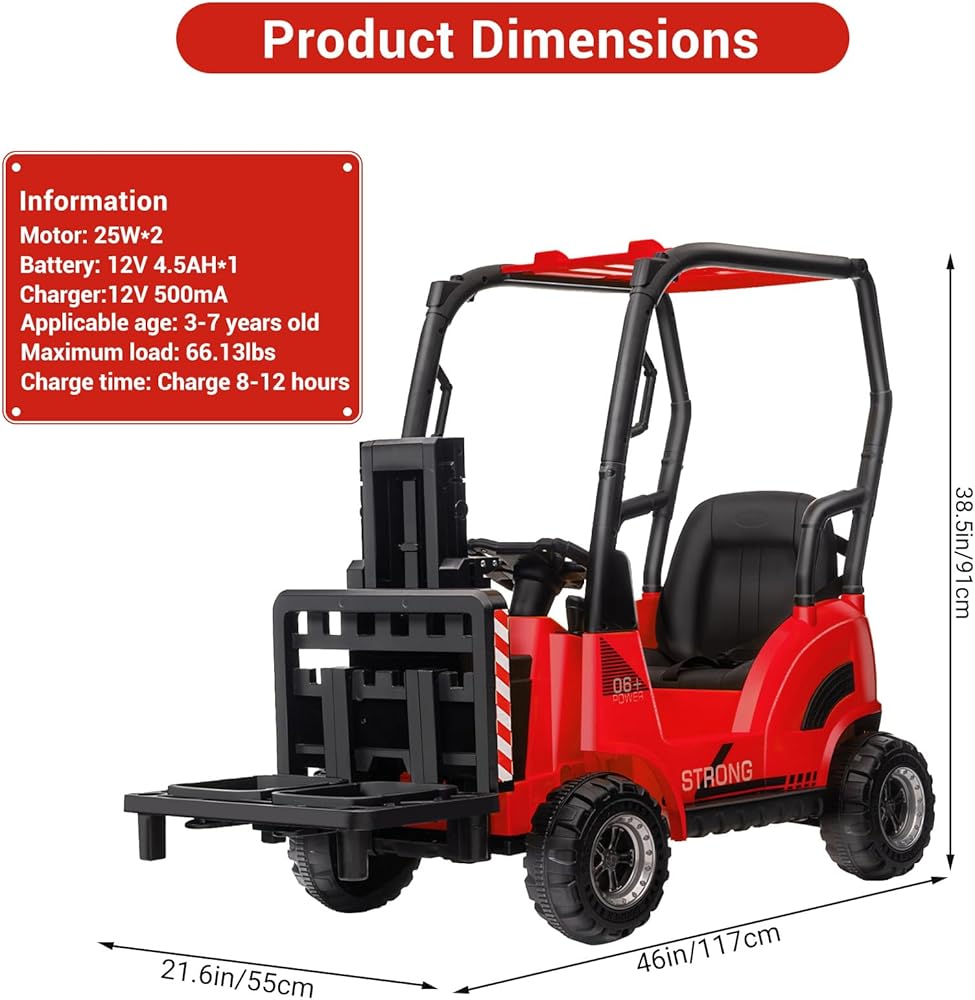 آمنة ومتينة: بحجم إجمالي 46 بوصة × 21.6 بوصة × 38.5 بوصة (طول × عرض × ارتفاع) وسعة تحميل قصوى تبلغ 66.13 رطل، هذه الرافعة الشوكية مناسبة للأطفال من سن 3 إلى 7 سنوات. يتضمن تصميم المقعد حزام أمان لمزيد من الحماية، مما يجعله خيارًا آمنًا ومريحًا للراكبين الصغار في الداخل والخارج، ويشجع على اللعب في الهواء الطلق والنشاط البدني.