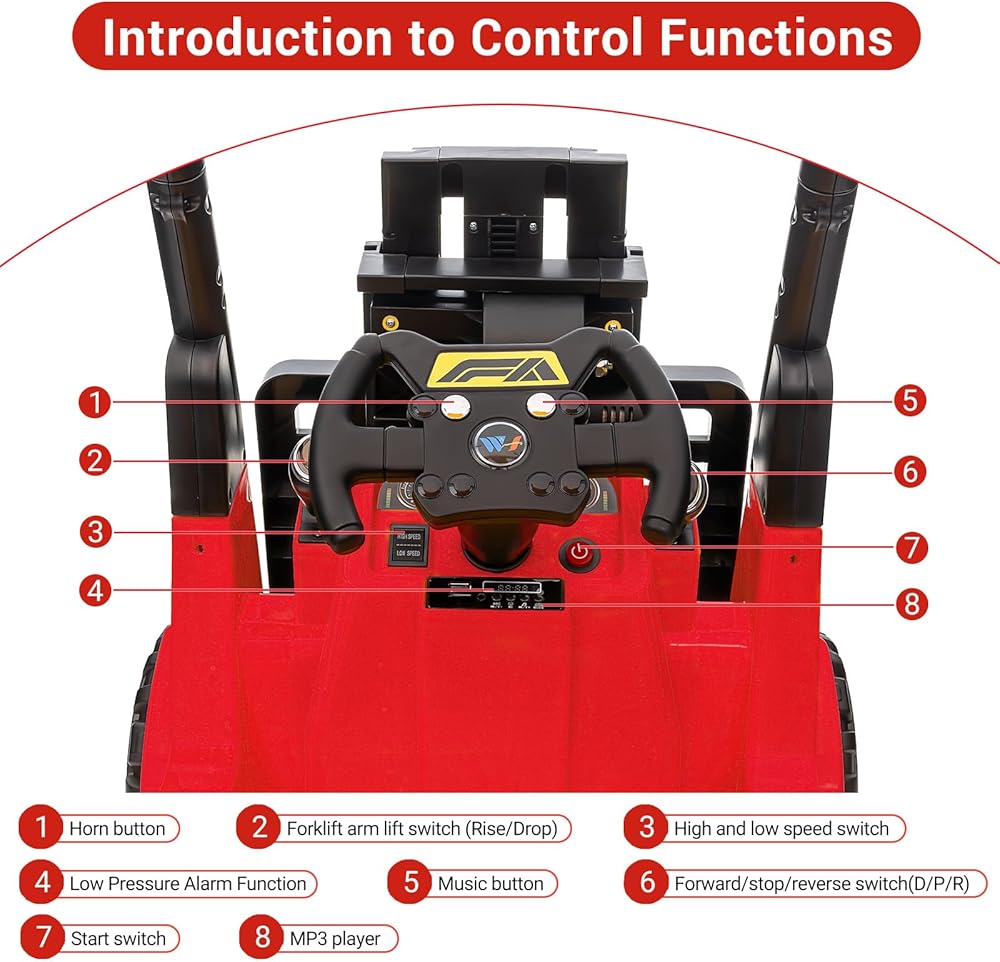 الميزات التفاعلية: تأتي هذه الرافعة الشوكية مجهزة بموسيقى مدمجة، ومفتاح تغيير السرعة، ومفتاح للأمام والخلف، وزر بوق، وفتحة USB، وفتحة MP3 لتشغيل الموسيقى. توفر هذه الميزات مجموعة من خيارات الترفيه للأطفال، مما يضمن أن تكون كل رحلة مليئة بالمرح والإثارة.