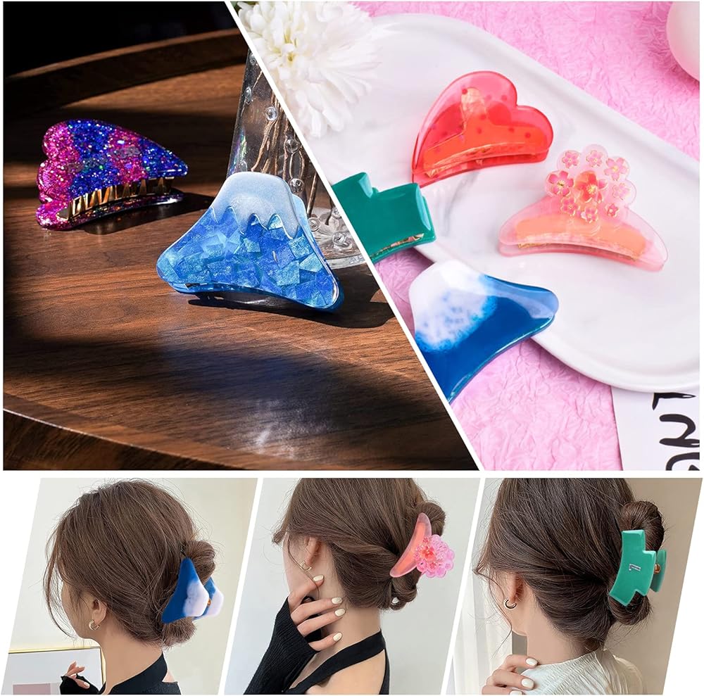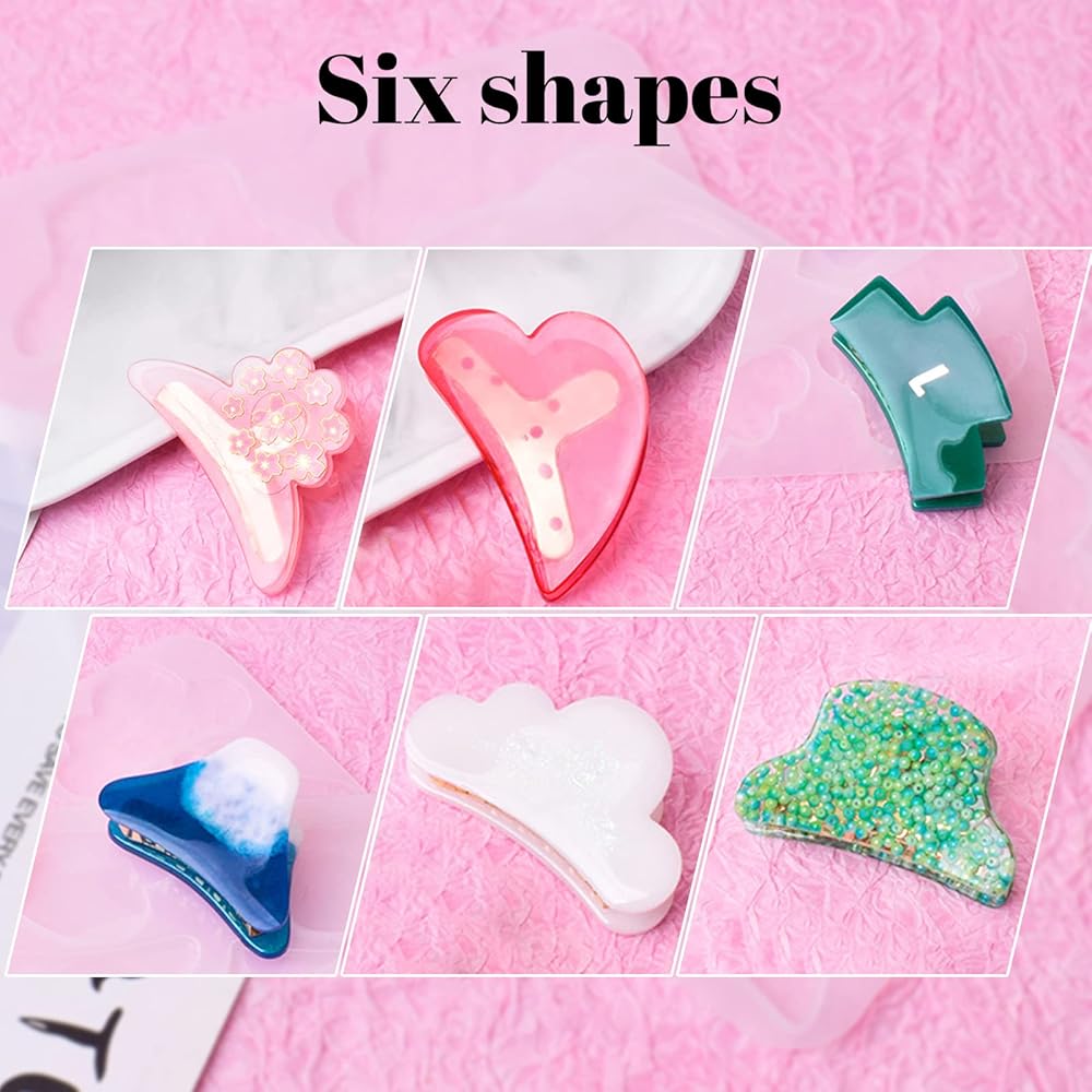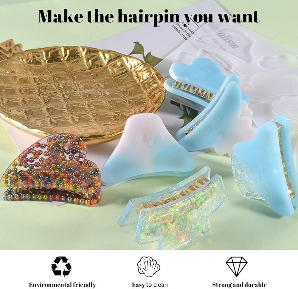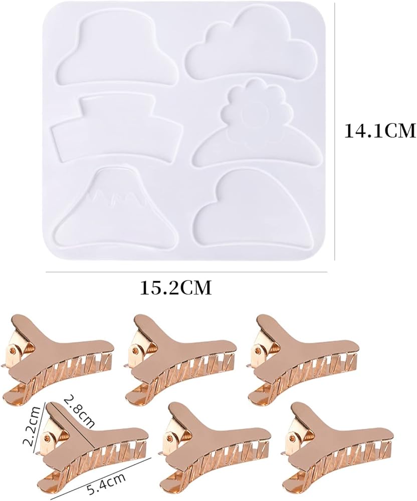【QUALITY MATERIAL】: The hairpin resin mould is made of high-quality silicone, soft, flexible, resistant to tearing, which can be used for a long time. The hair barrettes are made of alloy, the surface comes with electroplating process, smooth, not easy to be faded, bright and elegant. 【SIZE】: Mold size: 15.2*14.1cm/ 5.98*5.55 inch. Golden hair clip accessories size: approx. 5.4*2.2*2.8cm/ 2.12*0.86*1.1 inch. The Hair Clips mold Set come with 6 different fashion shape to meet your various DIY creative. 【UNIQUE DIY CRAFTS】: You will get a hair clip resin molds and 6pcs hair claw accessories. You can add glitter, small dried flowers, trinkets, or embellishments to the silicone mold, make your own unique project. 【EASY TO DEMOLD】: The inside of the silicone mold is smooth and shiny, you just need to twist the silicone mould and release creation out of it after the resin is completely cured. 【SPECIAL GIFTS】: These Resin Molds can make beautiful hair claw clips which are ideal gifts for your friends and families on birthday, Christmas, Mother's day, Valentine's day, New Year, etc.