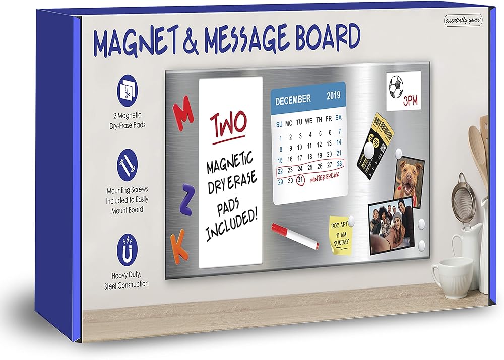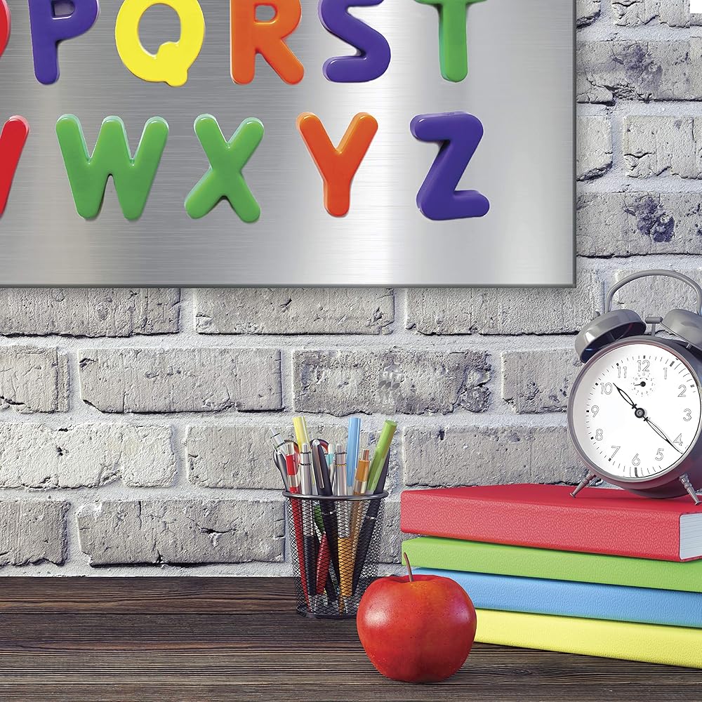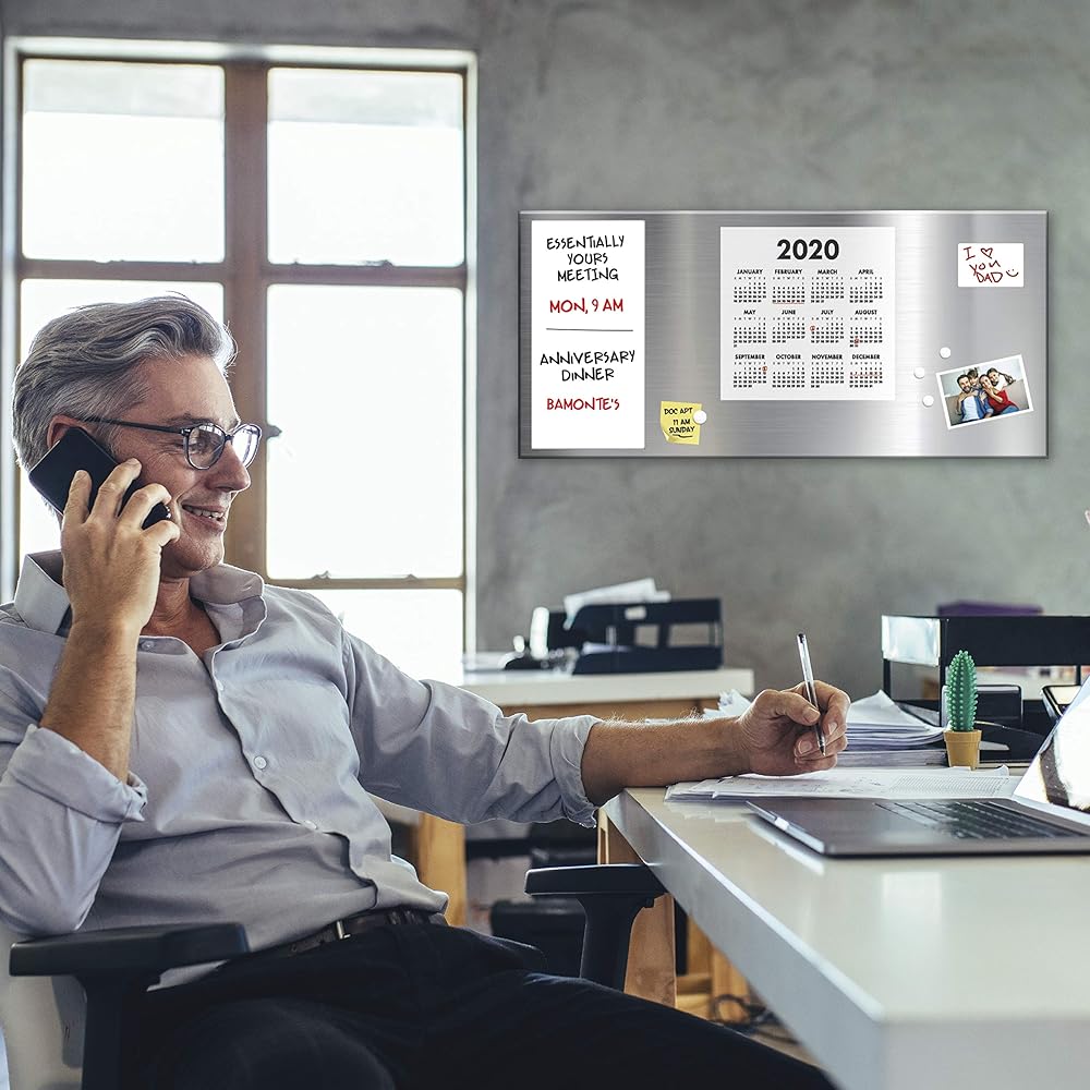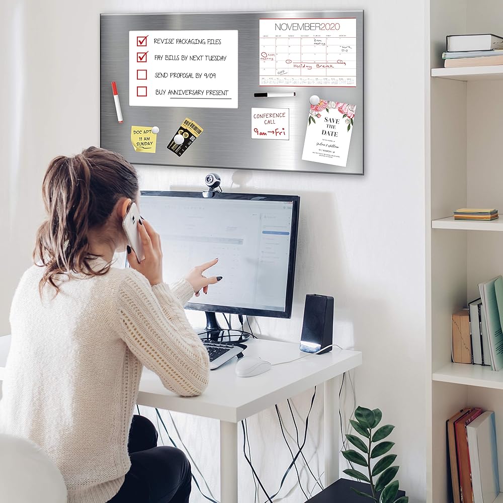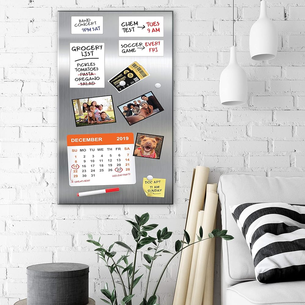 بشكل أساسي لك المغناطيس ولوحة الرسائل | لوحة إعلانات فولاذية كبيرة قابلة للتركيب مقاس 30 × 14 × 0.7 بوصة، تتضمن وسادتين مغناطيسيتين للمسح الجاف (فضي)