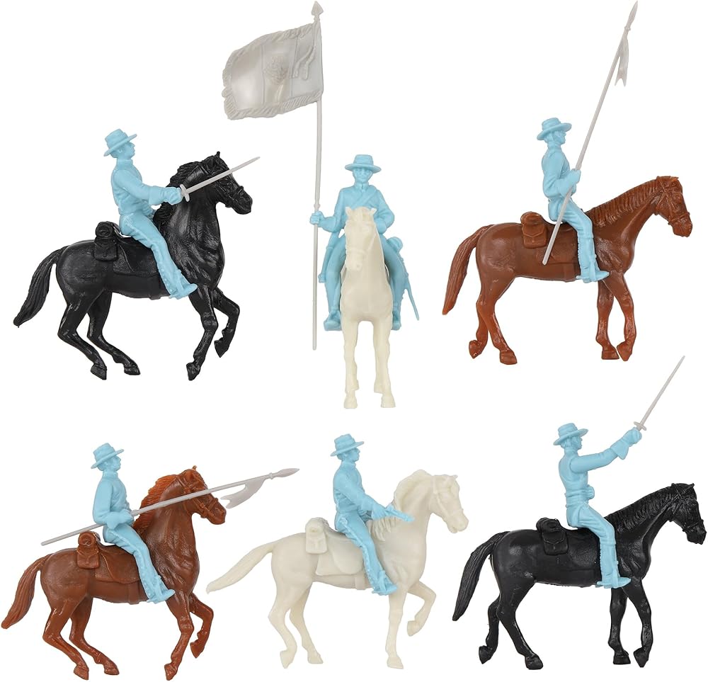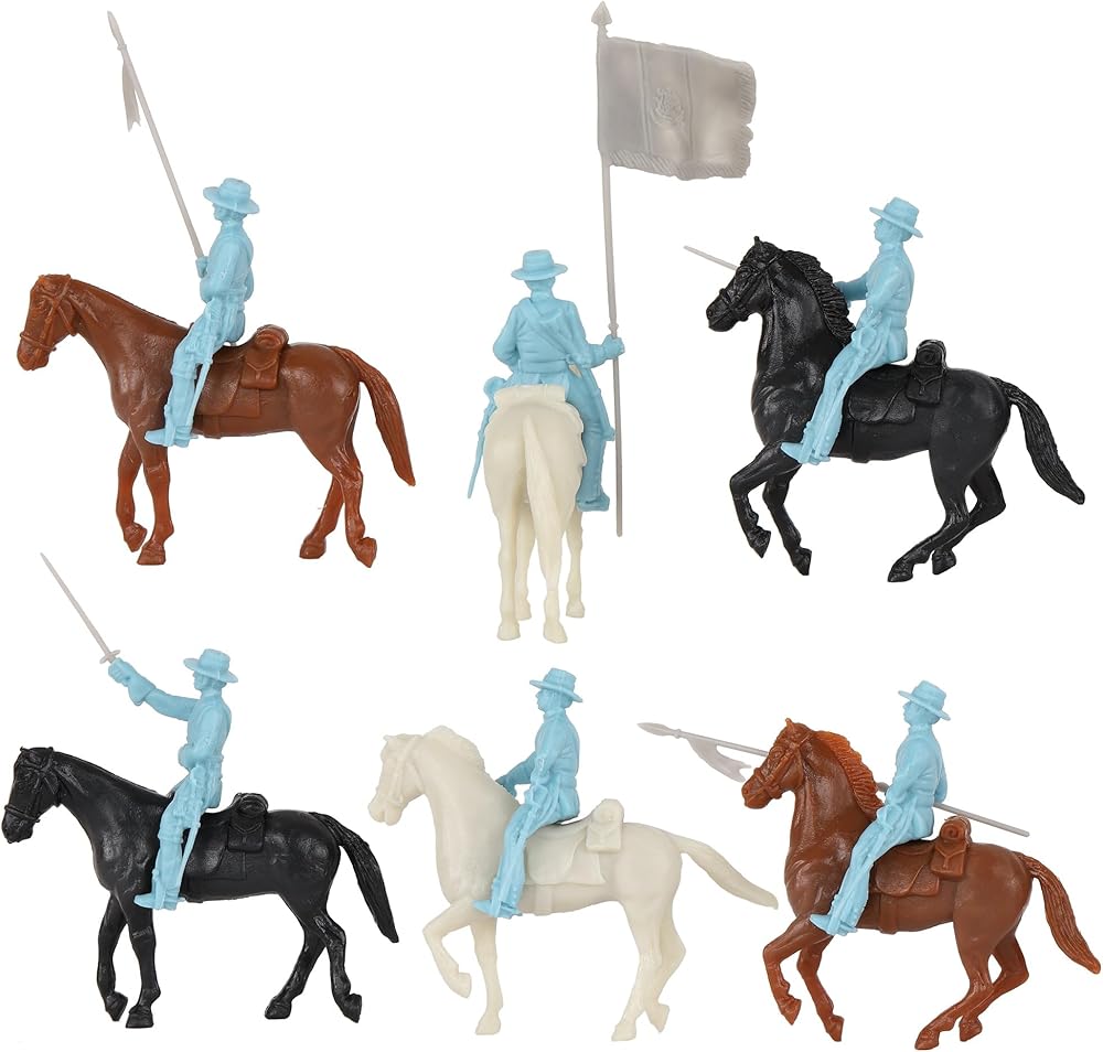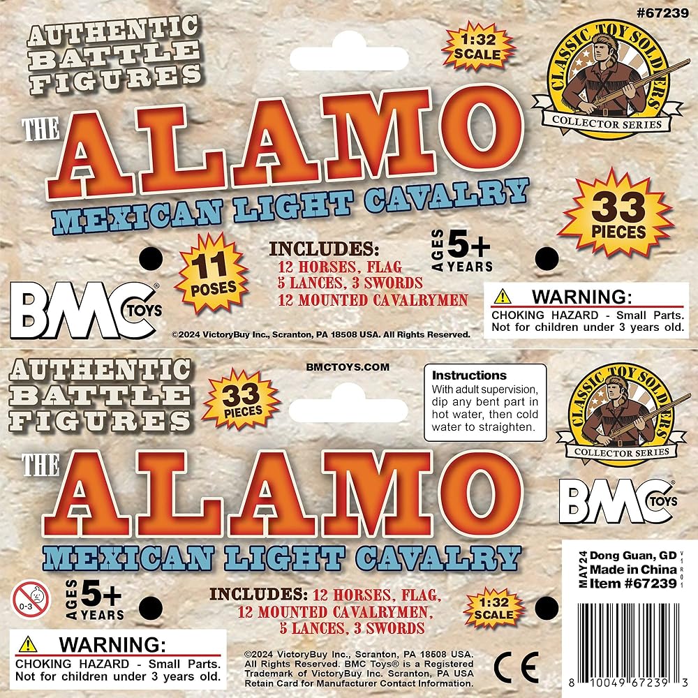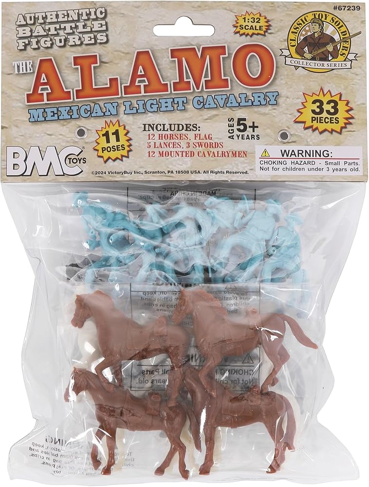 From the BMC Toys CLASSIC TOY SOLDIER COLLECTOR SERIES, the swift forces that helped defeat the Alamo defenders. The ALAMO MEXICAN LIGHT CAVALRY 33 piece plastic army men set features 12 powder-blue Cavalrymen in 11 different poses, 12 horses, 8 weapons, and a flag. The horses have 4 poses each in black, brown,and off-white. Made from soft plastic with lots of detail. Figures mounted on horses stand up to 3.15 inches tall and are approximately 1:32 scale.