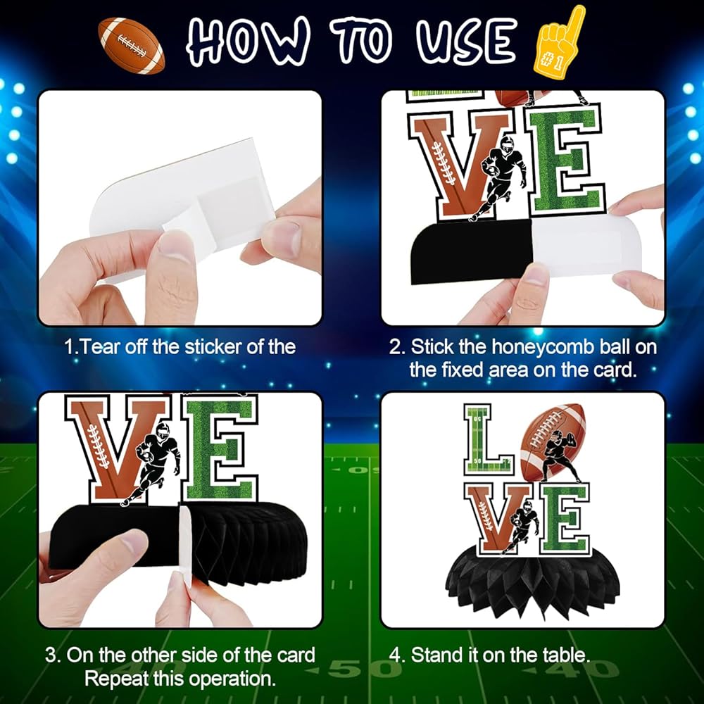 Easy to Assemble: The football theme birthday party decorations are simple to assemble. Peel off the double-sided tape, unfold the honeycomb base, and paste them together. Then you get a beautiful football party table decor. These football centerpieces for banquet make your party cheerful and fun.