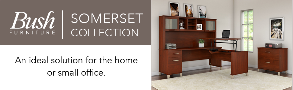 Add a touch of professional style to your workspace with the Bush Furniture Somerset 60W Office Desk with Lateral File Cabinet and 5 Shelf Bookcase. With its practical features and a sophisticated design, this set offers an ideal solution to outfit a home or small office. The durable and spacious 60W surface provides plenty of room to spread out with a computer, paperwork and more while taking on your daily tasks. Two file drawers hold letter size files and a pair of box drawers accommodate office supplies. The back of the Desk is finished to allow for placement anywhere in the room. The 2 Drawer File Cabinet utilizes smooth ball bearing slides for easy access to legal and letter size files, even those all the way in the back. Two drawers are interlocking to reduce the likelihood of tipping, making the filing cabinet a safe and family-friendly storage solution. Two of the Bookcase's shelves are fixed for stability and three are adjustable to ensure that items of all sizes have their place. Transitional styling includes stylish Hansen Cherry, Mocha Cherry, and Maple Cross finishes with tapered leg accents and contemporary metal hardware for an alluring appearance. See the full line of products from the Somerset Collection to make a professional statement in your home office. This quality furniture is tested to meet ANSI/SOHO standards for safety and performance and is backed by the Bush Furniture 6 Year Manufacturer's Warranty. American made with U.S. and imported parts.