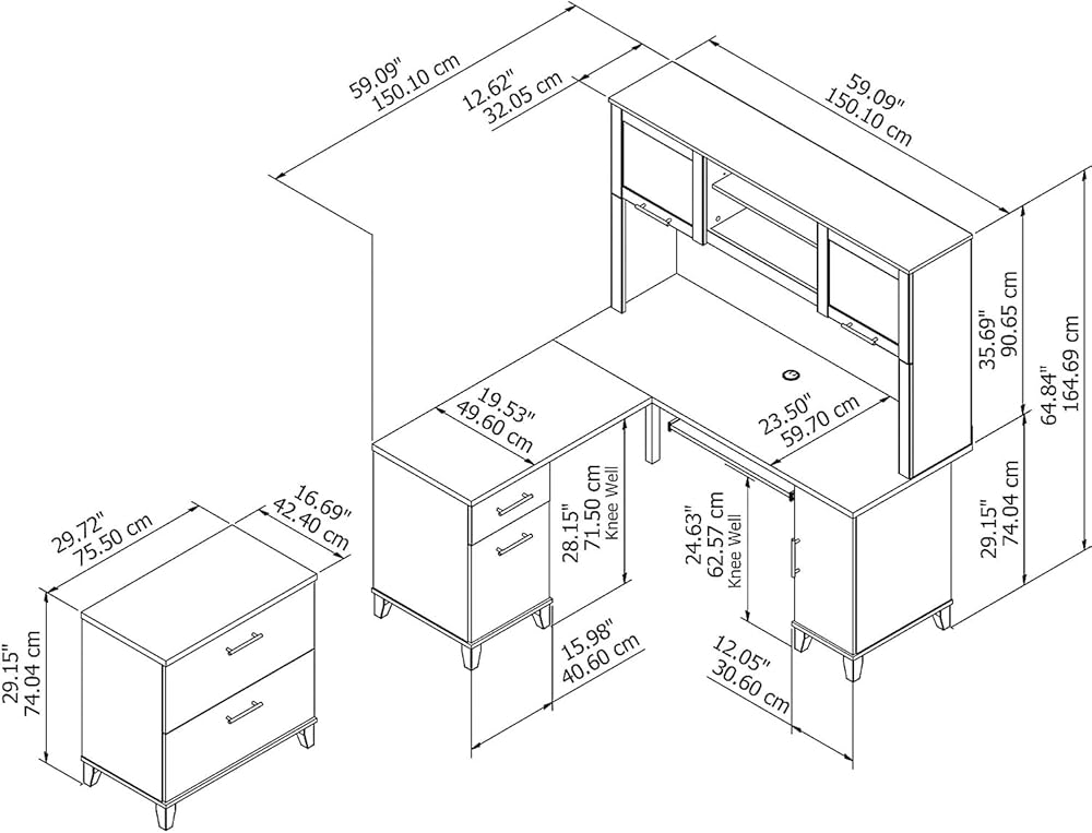 Bundle includes: 60W L Shaped Desk with Storage, 60W Desk Hutch, 2 Drawer Lateral File Cabinet