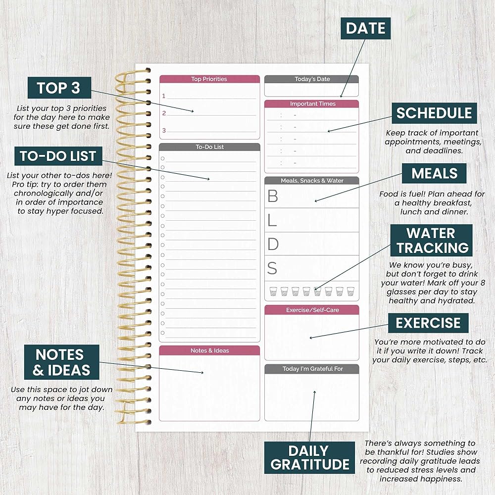 التصميم: تتضمن الحقول الموجودة في كل ورقة يومية ما يلي: 3 خطوط أولوية عليا، و16 سطرًا لقائمة المهام، وقسم "الأوقات المهمة"، وقسم الوجبات مع مساحة للإفطار والغداء والعشاء والوجبات الخفيفة بالإضافة إلى تتبع المياه وممارسة الرياضة وقسم الرعاية الذاتية، تتبع الامتنان اليومي، وقسم الملاحظات والأفكار.