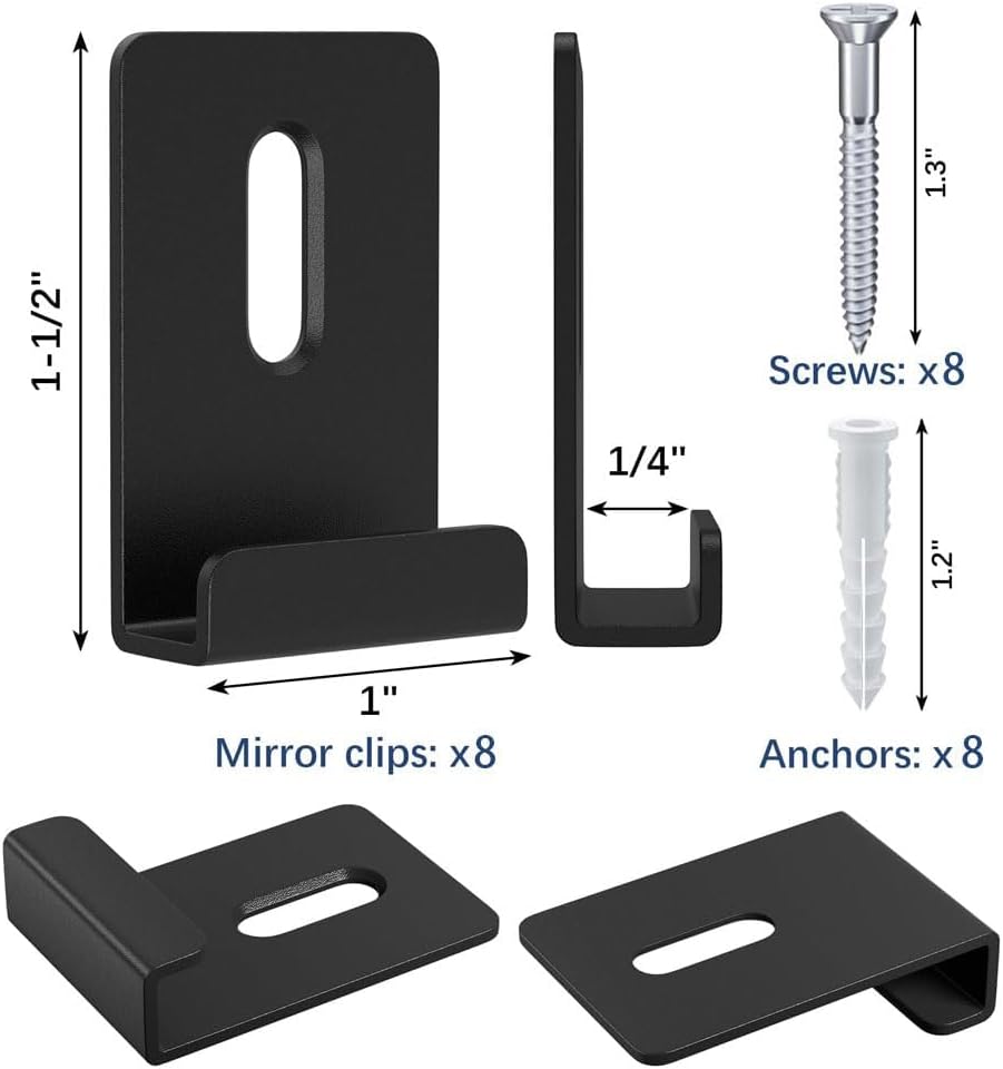 【COMPLETE KIT】This mirror frame kit includes 8 wide channel metal mirror brackets, 8 screws, and 8 anchors. The metal mirror clips are sized at 1/4 inch deep, 1 inch wide, and 1-1/2 inches high, suitable for mirrors with an edge thickness of 1/4 inch.