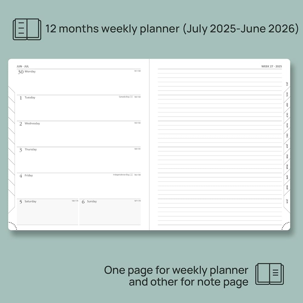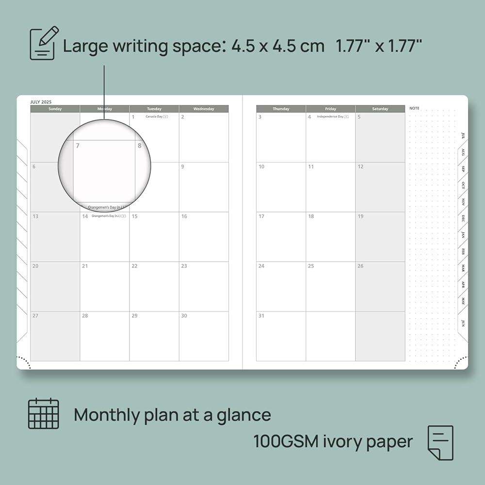 تصميم أسبوعي فعال: يوفر التصميم الأسبوعي الأفقي صفحتين في الأسبوع، بما في ذلك صفحة الملاحظات لكل أسبوع، مما يضمن مساحة كافية للتخطيط التفصيلي. بالإضافة إلى ذلك، يتضمن كل تخطيط شهري نظرة عامة على الشهر وقسمًا مخصصًا للملاحظات.