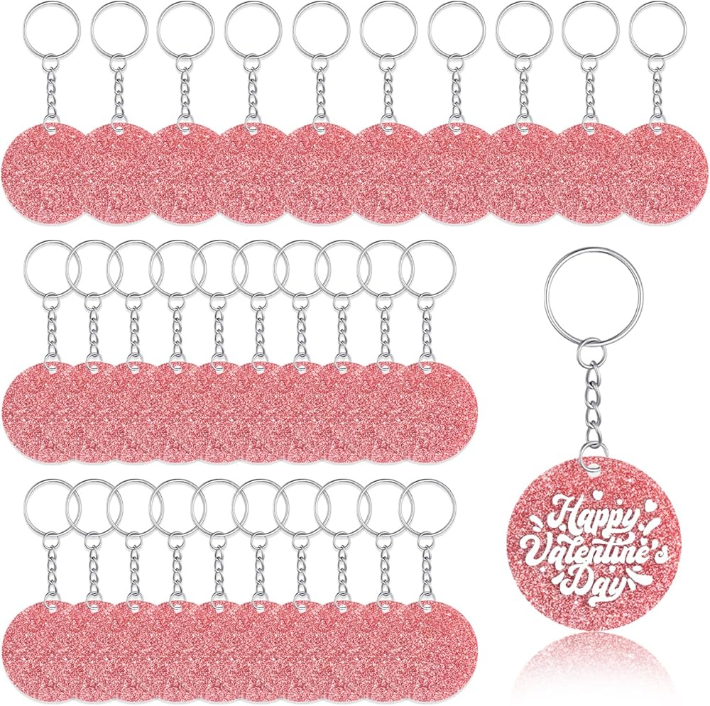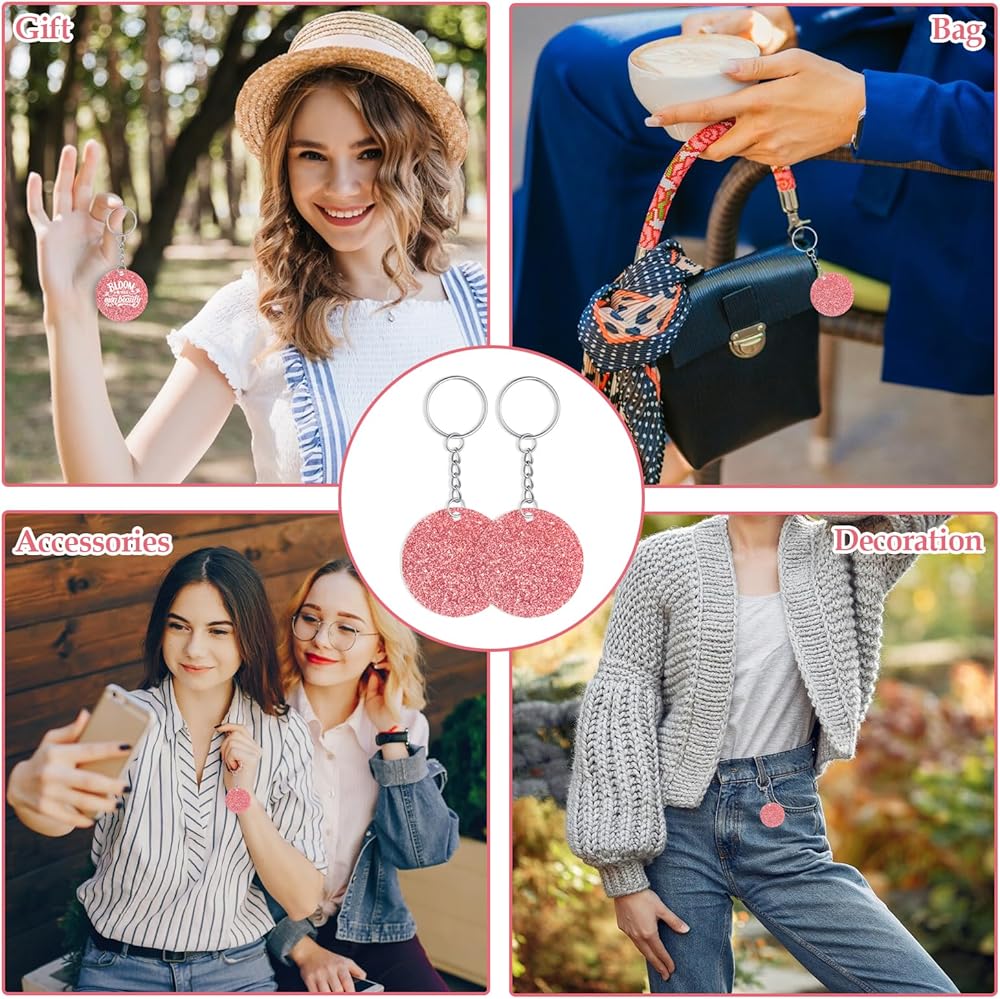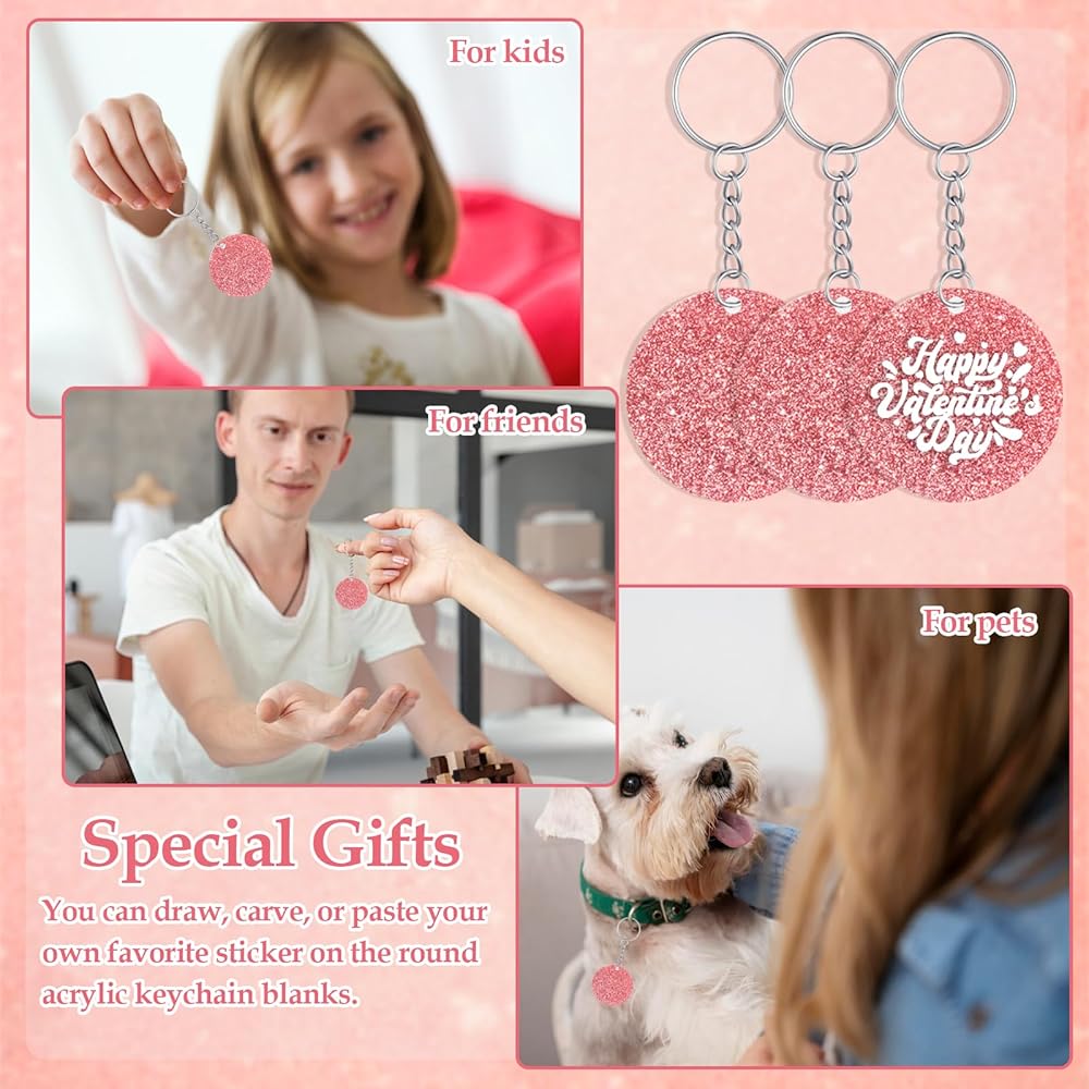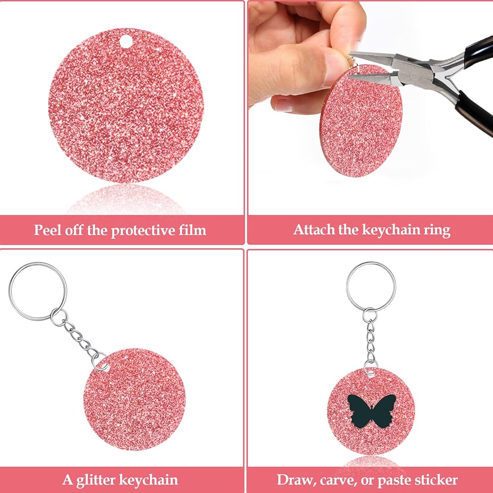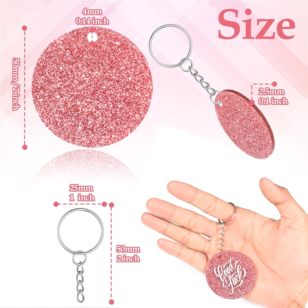 1.30pcs DIY Keychains Making Kits - Acrylic Keychain Blanks sets comes with 30pcs Rose Gold Round Acrylic Blanks, 30pcs Keychain Rings 30pcs Jump Rings and 30pcs Pink Tassels.The Keychain Rings diameter are 1 inch,jump rings diameter are 0.3 inch. Clear Glitter Colored Acrylic blanks are 2 inches in diameter and 0.1 inch thick.Pink Tassels are 1.5 inches.