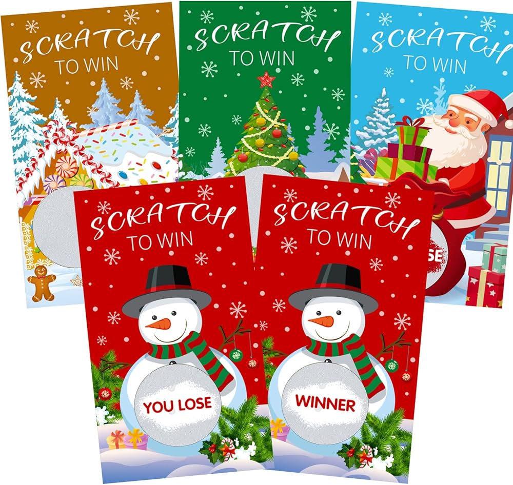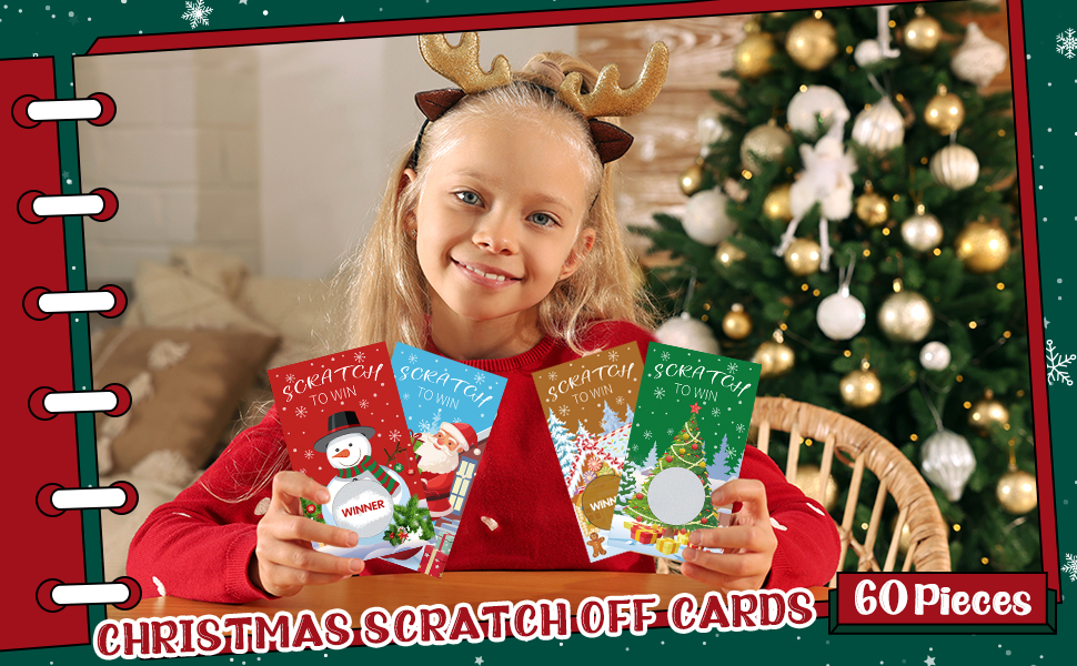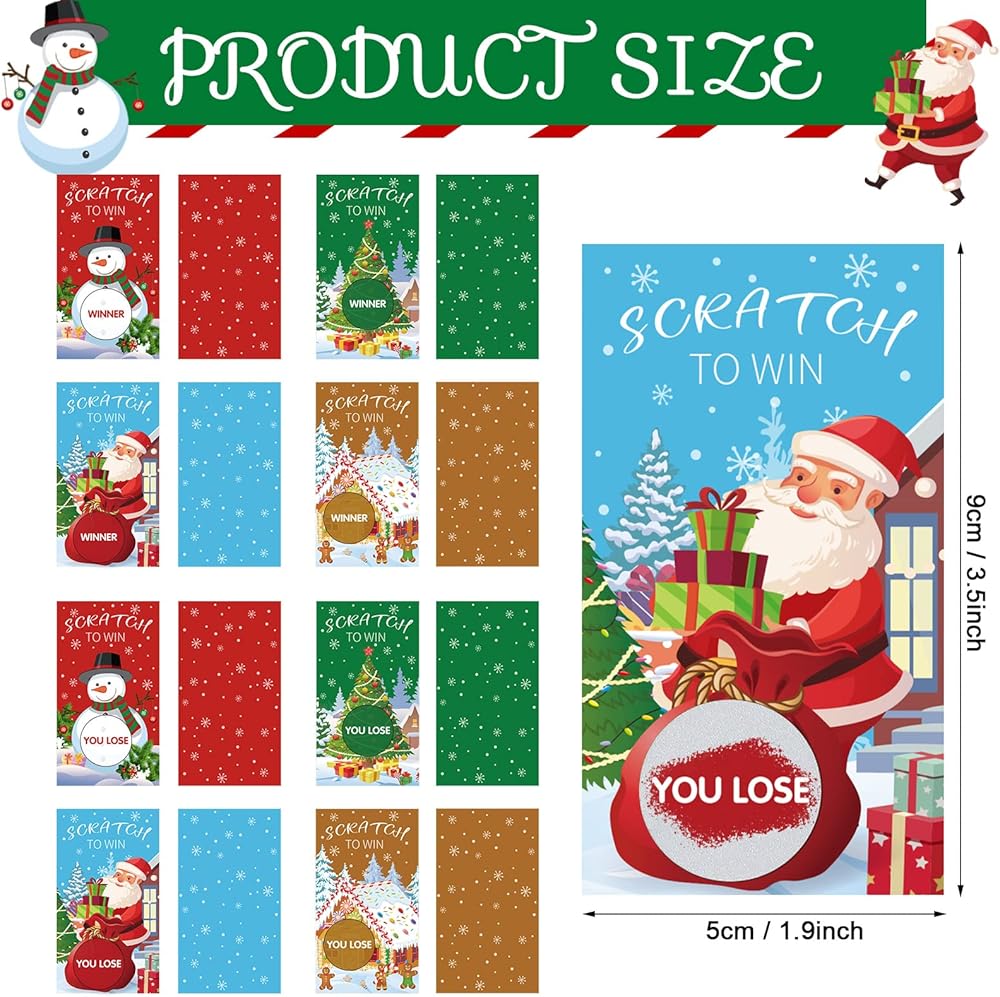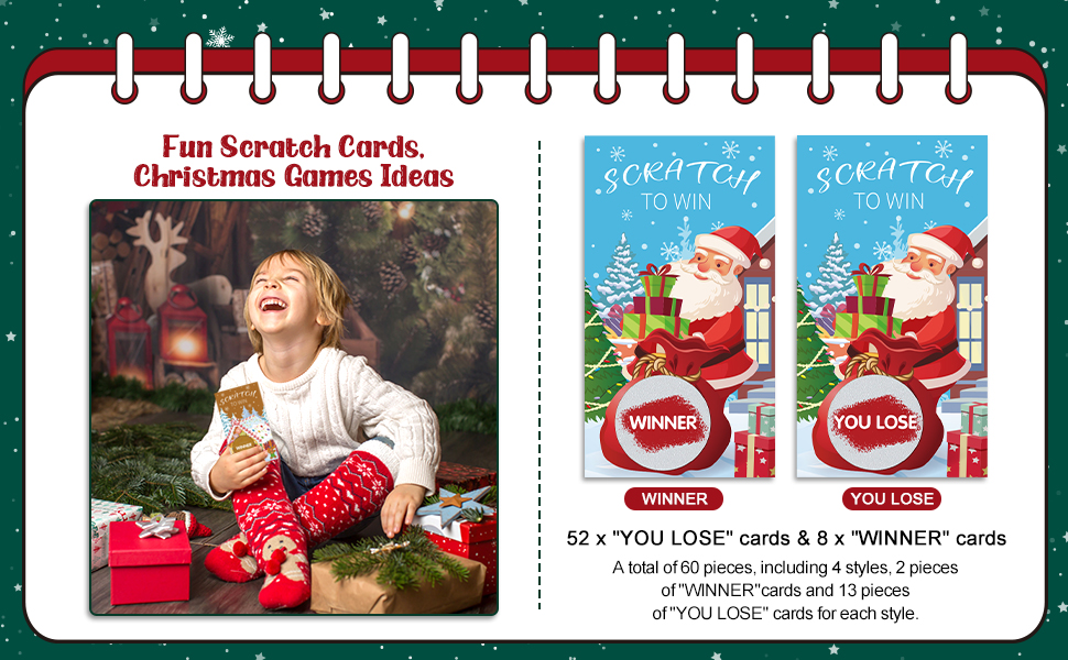• مجموعة بطاقات خدش عيد الميلاد: اشترِ منتجاتنا، وستحصل على 60 قطعة من بطاقات خدش عيد الميلاد، و52 قطعة من بطاقات "الخاسر" و8 بطاقات "الفائز"؛ هناك 4 أنماط من بطاقات الخدش، المطبوعة عليها سانتا كلوز، وأشجار عيد الميلاد، ورجل الثلج وخبز الزنجبيل، وكمية كافية لألعاب مجموعات الحفلات وهدايا حفلات السحوبات.