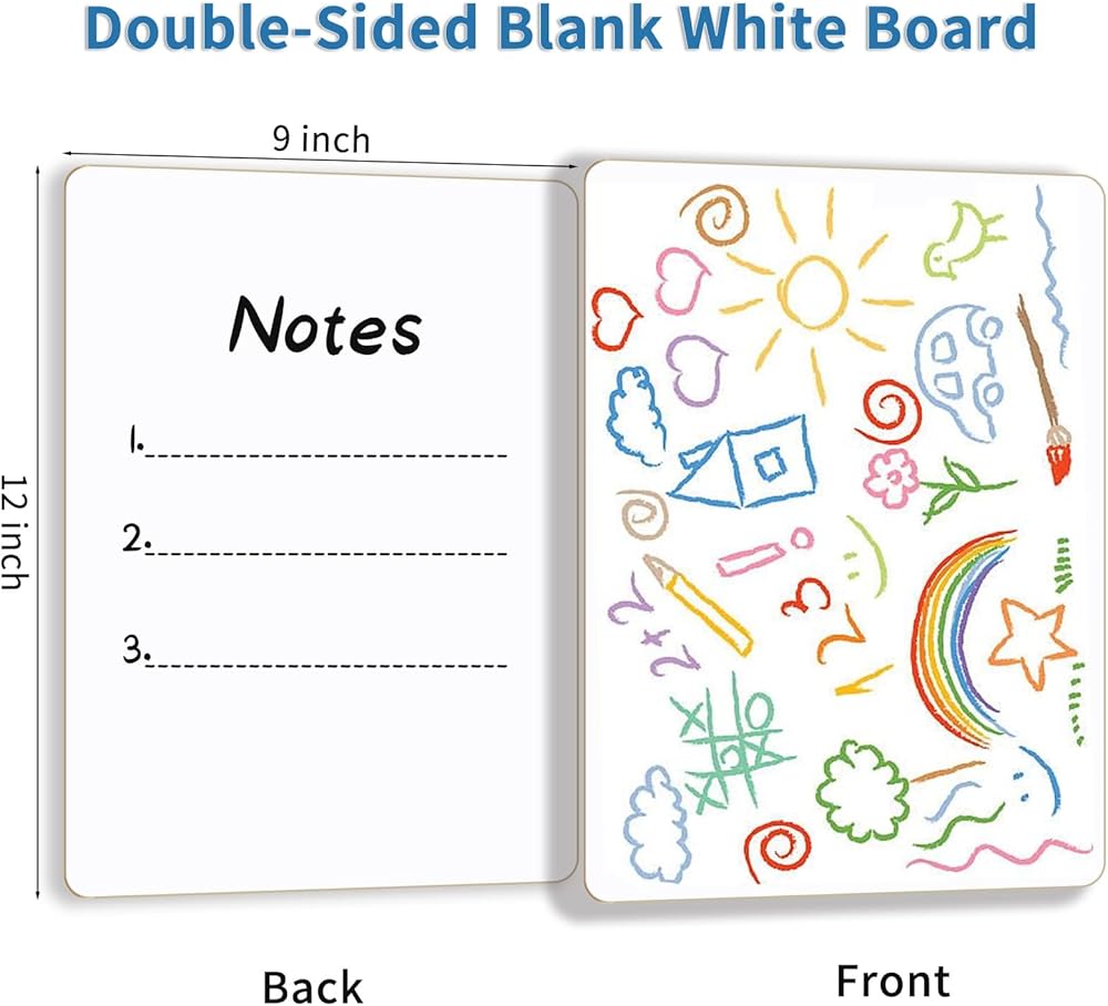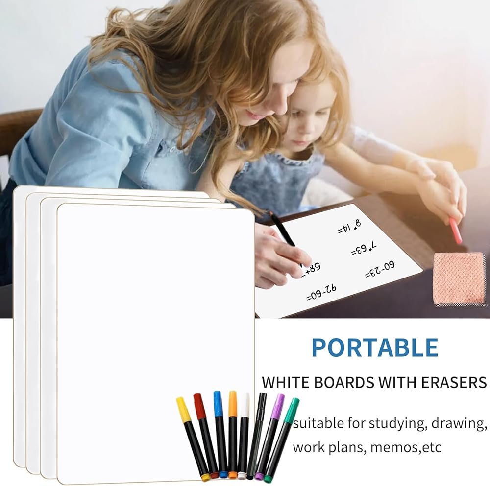 【4 Pack Small White Board Set】:Includes Double Sided 4 sturdy 9"×12" whiteboards and 8 color markers and 1 dry wiping cloth.