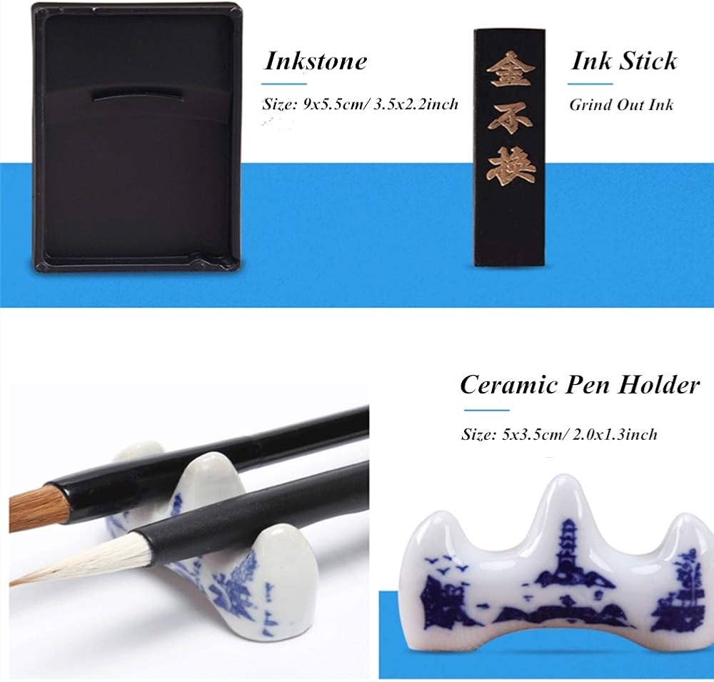 • ✍ مجموعة الخط: تحتوي مجموعة الخط الصيني هذه على جميع الأدوات التي تحتاجها لكتابة الخط الصيني، وورق قماش للكتابة المائية، وفرشاة، وحبر، وحامل قلم، وحجر الحبر، وعصا الحبر واللباد. تأتي مع حقيبة تخزين.