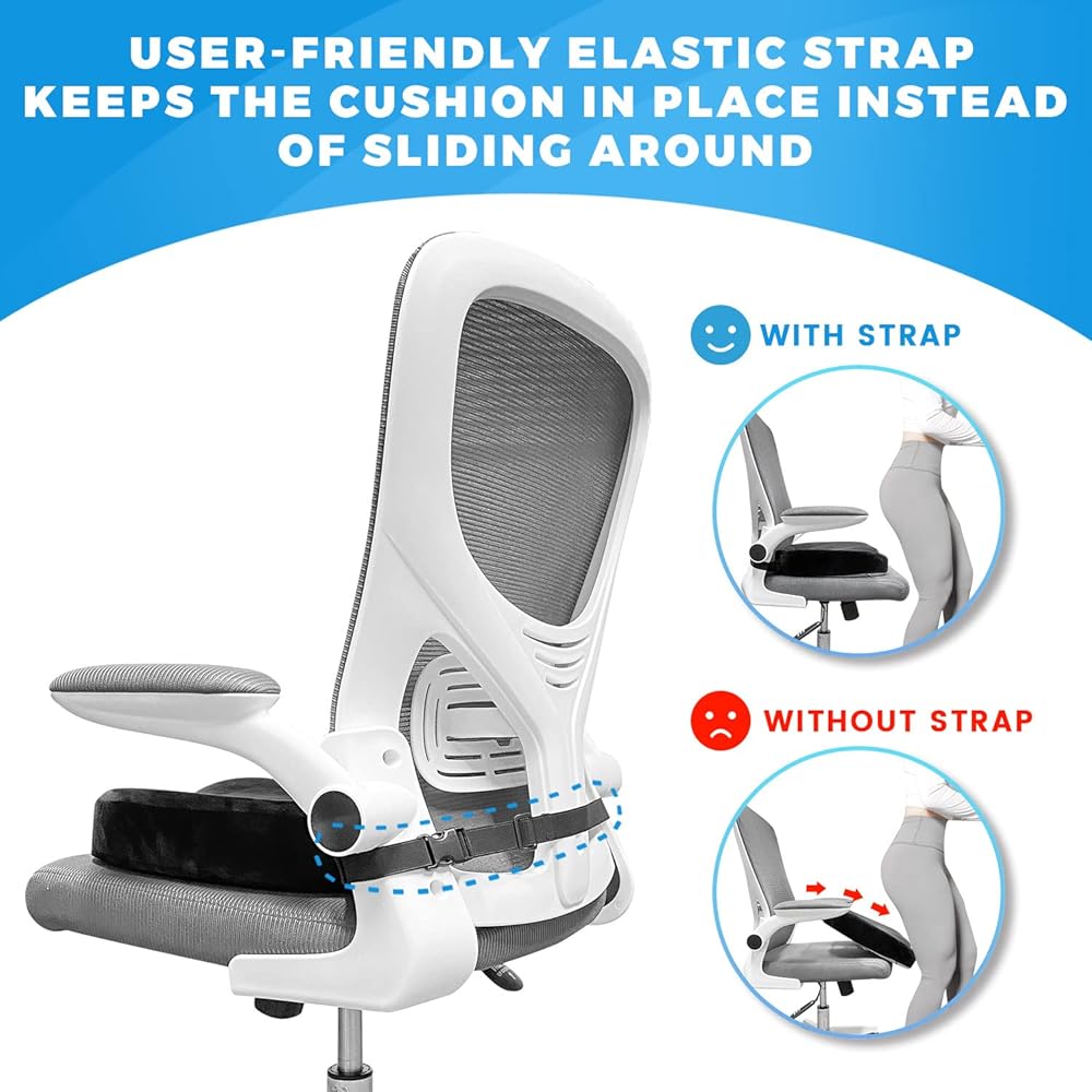 تصميم مزدوج مضاد للانزلاق - الوسادة العادية لكرسي المكتب في السوق تحتوي فقط على قاعدة غير قابلة للانزلاق، والتي يمكن أن تبقي وسادة كرسي المكتب في مكانها على الجلد أو القماش أو في مكان ما بسطح خشن. ولكنها لا تعمل على الأسطح الملساء مثل الكراسي الرخامية، والكراسي الخشبية. لا تحتوي وسادة مقعد العصعص لدينا على قاعدة مضادة للانزلاق فحسب، بل تحتوي أيضًا على حزام مطاطي قابل للتعديل. يمكن لهذا التصميم المزدوج المضاد للانزلاق تثبيت وسادة المؤخرة بقوة ويخلصك من تعديل وسادتك بشكل متكرر لكرسي المكتب.