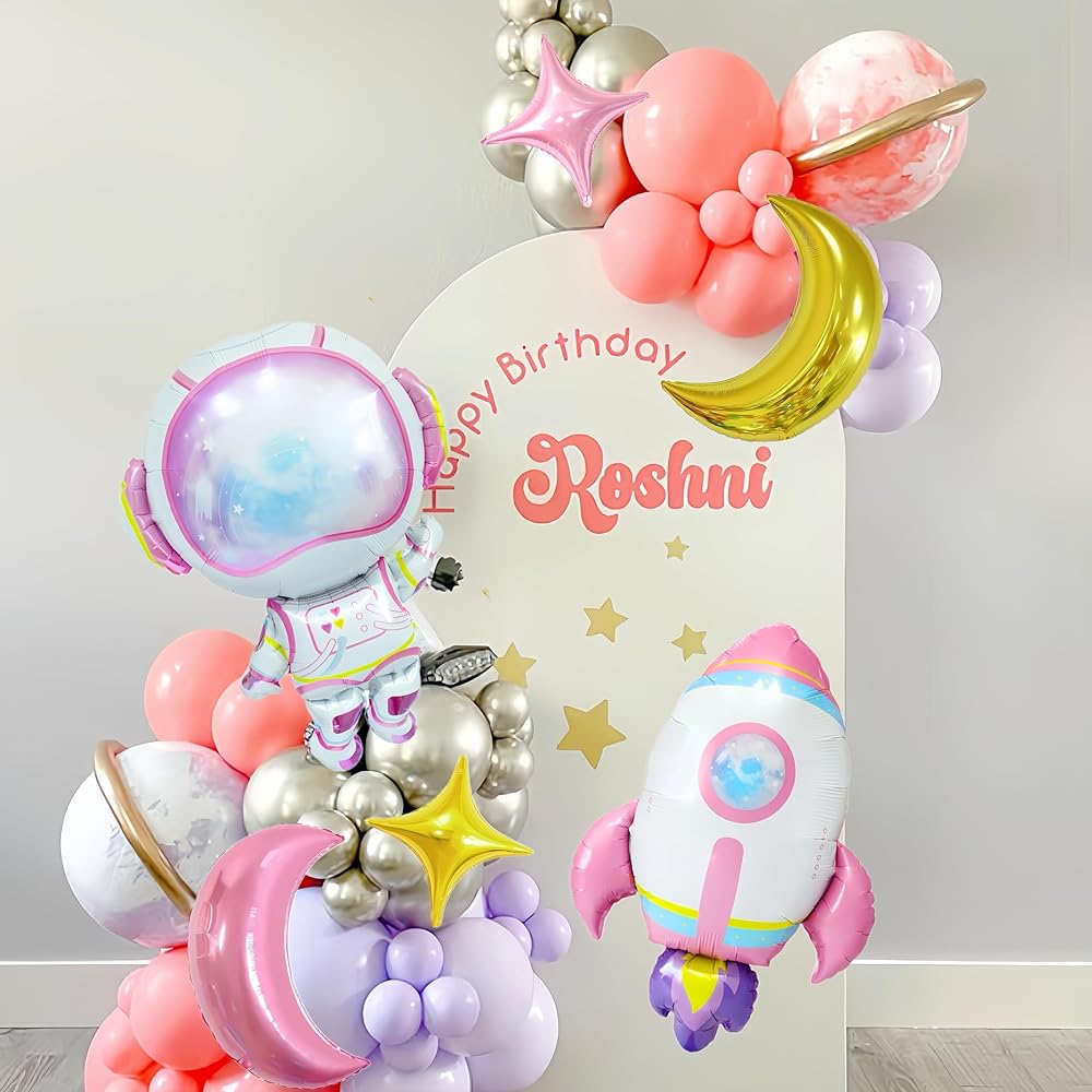 العناصر الكونية: بالونات رواد الفضاء الوردية والأرجوانية وبالونات كوكب العقيق ثلاثية الأبعاد ثلاثية الأبعاد في المجموعة تعيد إنتاج لغز واتساع الكون بشكل واضح، مما يلهم اهتمام الأطفال وأحلامهم في الاستكشاف الكوني.