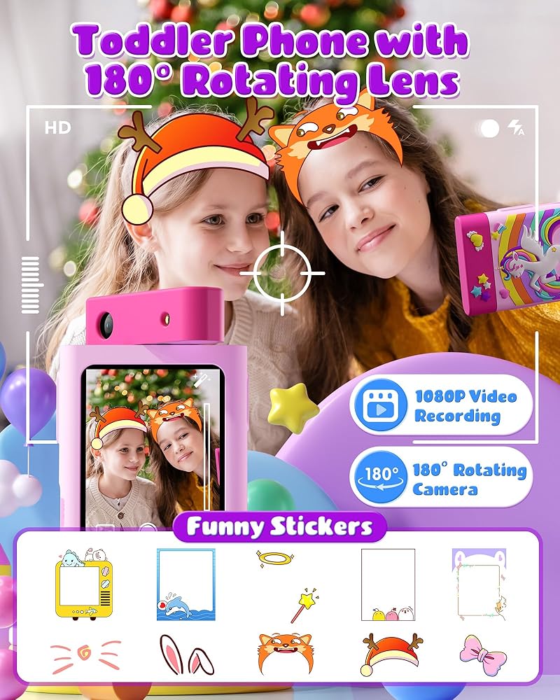 • 【كاميرا متعددة الزوايا】هاتف للأطفال مزود بكاميرا عالية الدقة قابلة للدوران مصممة بشكل فريد، قم بالتبديل بين الأمام والخلف لالتقاط الصور أو مقاطع الفيديو عن طريق تدوير الكاميرا. تأتي الكاميرا مع 26 نوعًا من الملصقات والتأثيرات مع عناصر لطيفة، يمكن للأطفال دمجها وفقًا لتفضيلاتهم الخاصة لجعل الصور ممتعة.