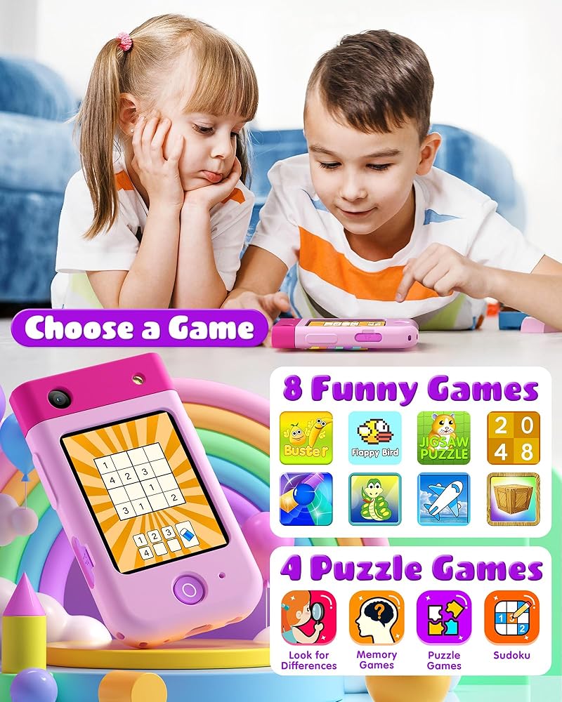 • 【هاتف أطفال متعدد الوظائف】تأتي لعبة الهاتف الذكي للأطفال مع شاشة لمس عالية الدقة وتوفر العديد من الأنواع المختلفة من التطبيقات والأدوات. يستخدمه الأطفال لالتقاط الصور ومقاطع الفيديو، والاستماع إلى الموسيقى والقصص، ولعب مجموعة متنوعة من ألعاب الألغاز لمنح الأطفال الذين تتراوح أعمارهم بين 3 و10 سنوات طعمًا ممتعًا للهواتف الذكية.