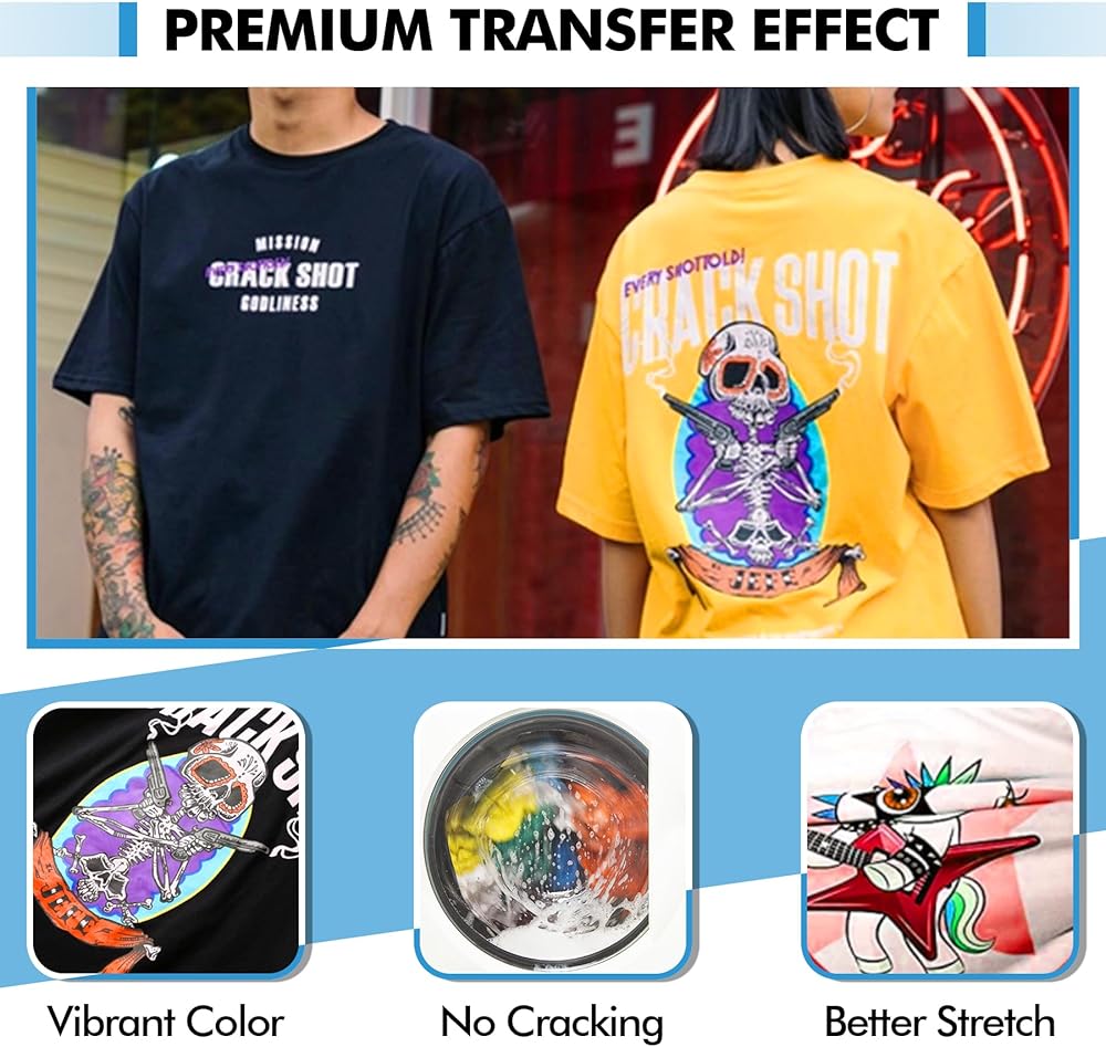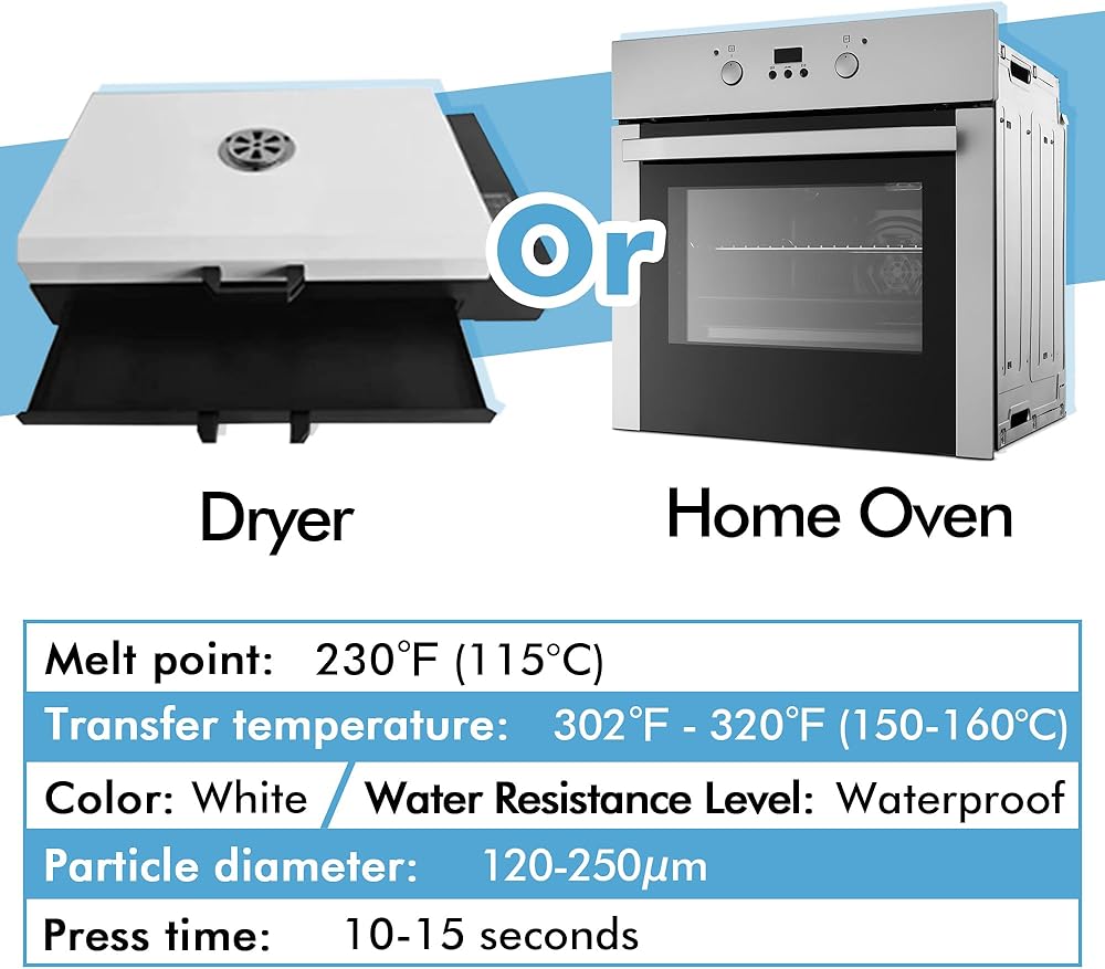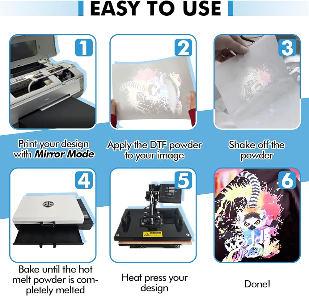 تأثير نقل ممتاز: تتميز التصميمات المنقولة باستخدام مسحوق DTF الخاص بنا بألوان زاهية وتفاصيل واضحة، كما أنها ناعمة ومريحة عند اللمس. درجة حرارة الخبز الموصى بها هي 115 درجة مئوية (239 درجة فهرنهايت) لمدة 3-4 دقائق.