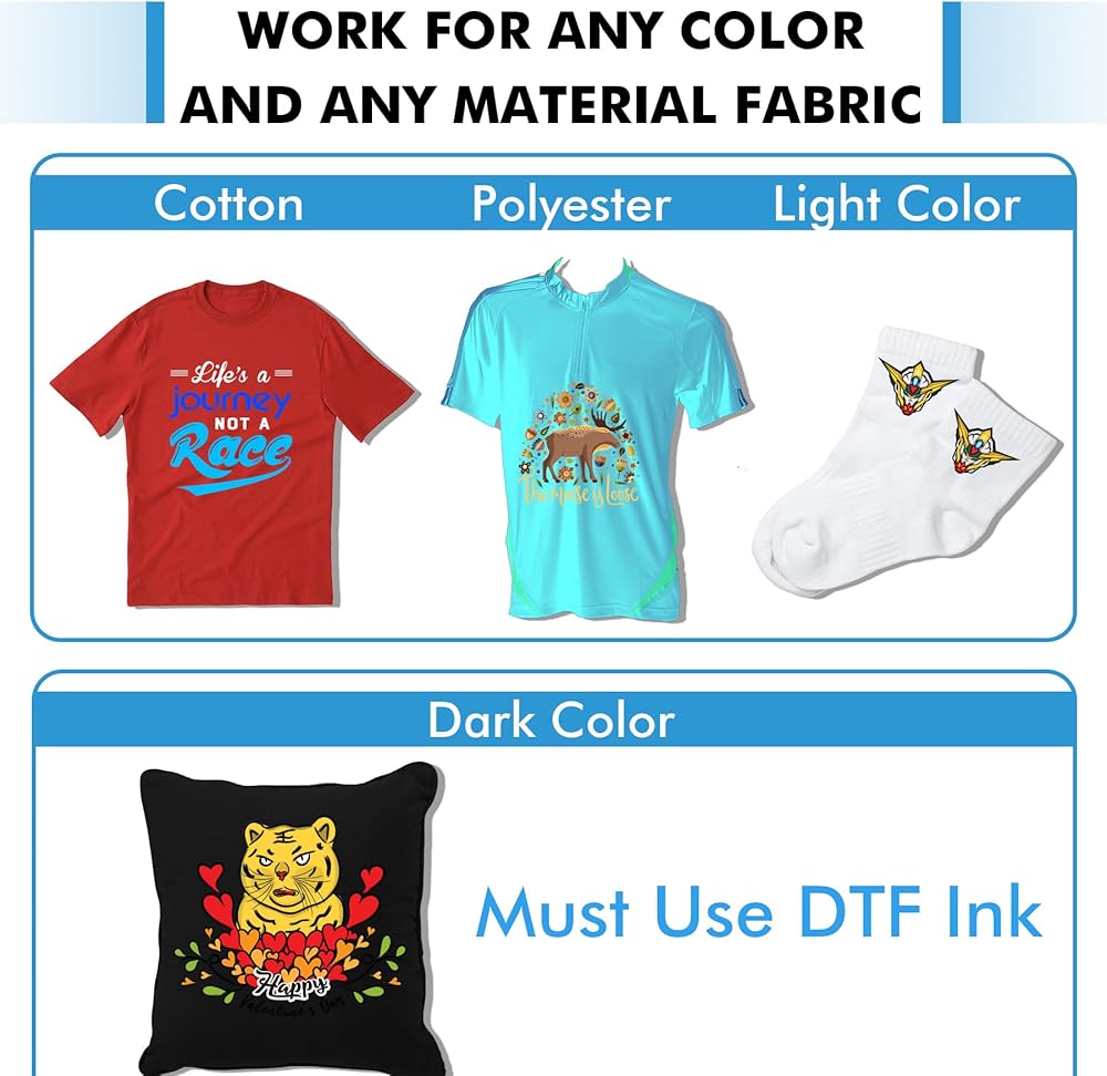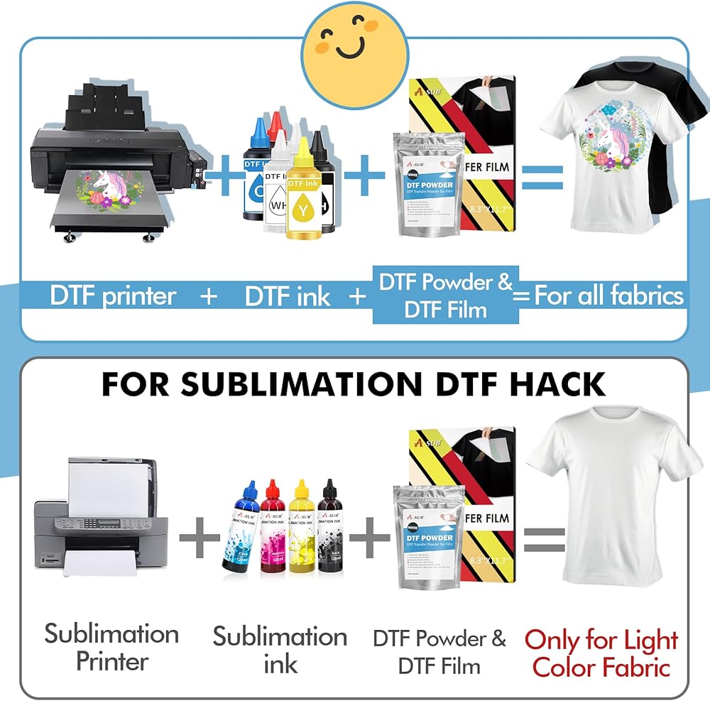نصائح ودية: بالنسبة لاختراق التسامي DTF، يرجى ملاحظة أنه إذا كنت تستخدم أحبار التسامي، فإن مسحوق A-SUB DTF للتسامي مناسب فقط للأقمشة ذات الألوان الفاتحة. إذا كنت تستخدم أحبار DTF، فسيتم دعم الأقمشة ذات الألوان الداكنة والفاتحة.