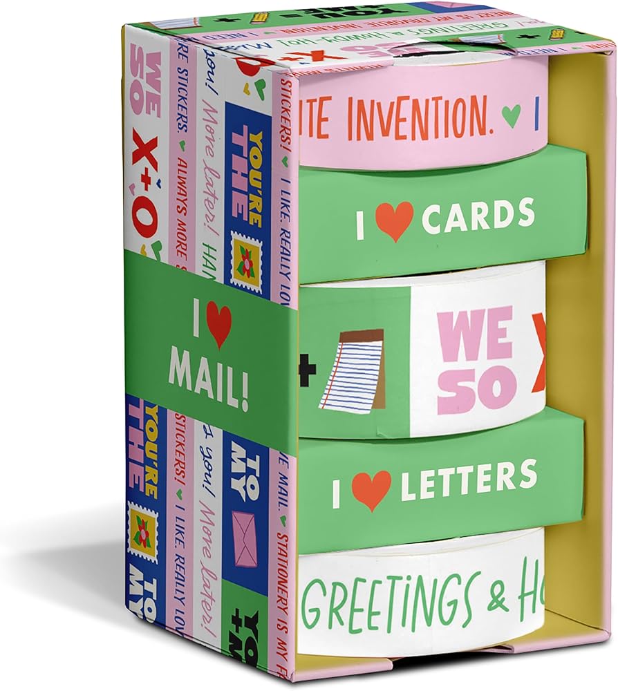 Includes: one (1) set of three (3) washi tape rolls. One roll measures 2.5 cm x 10 m, and the remaining 2 rolls measure 1.5 cm x 10 m. Giftable box is 2 x 3.75 x 2 inches. Designs/text on washi tape rolls include: "I like, really love mail." "Stationery is my favorite invention." "I need more stickers." and "You're the stamp to my envelope." "You + me = pencil + pad." "We so X + O".