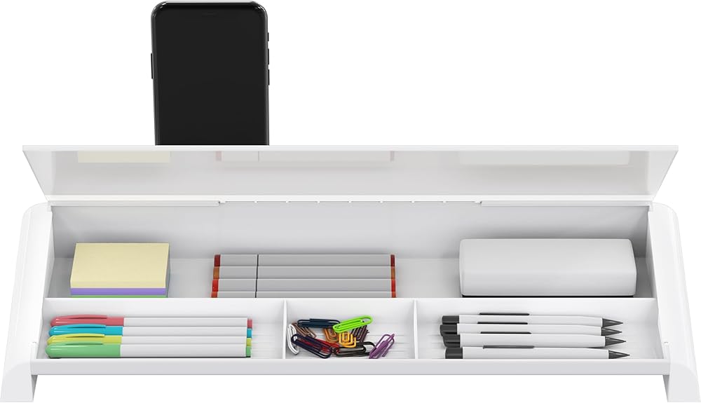 تخزين وصينية مريحة: قم بإزالة الفوضى من مكتبك عن طريق تخزين الأقلام والإكسسوارات في الدرج، أو إبقاء الأقلام في متناول اليد على صينية الملحقات. بالإضافة إلى ذلك، هناك صينية طويلة إضافية أعلى السبورة البيضاء لدفتر الملاحظات أو الجهاز المحمول الخاص بك.