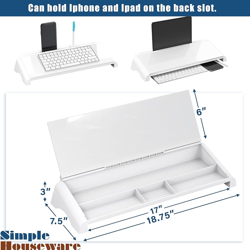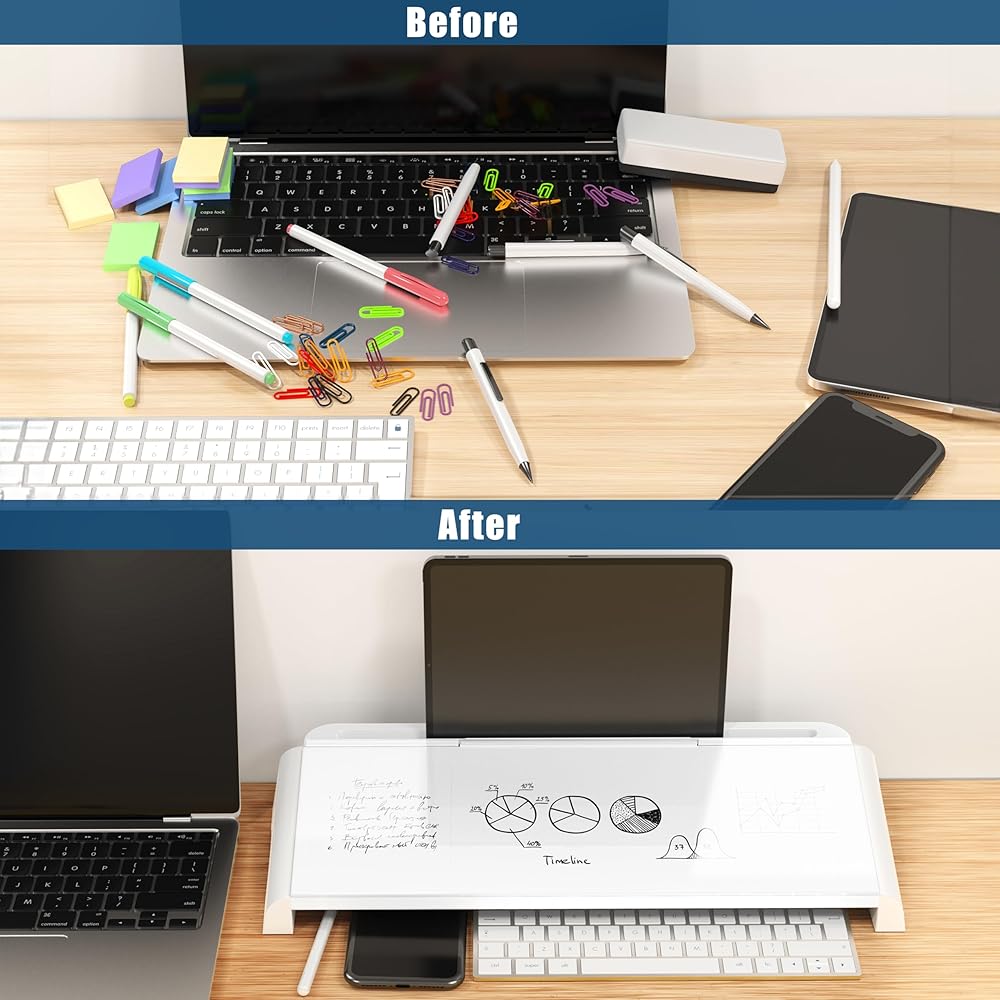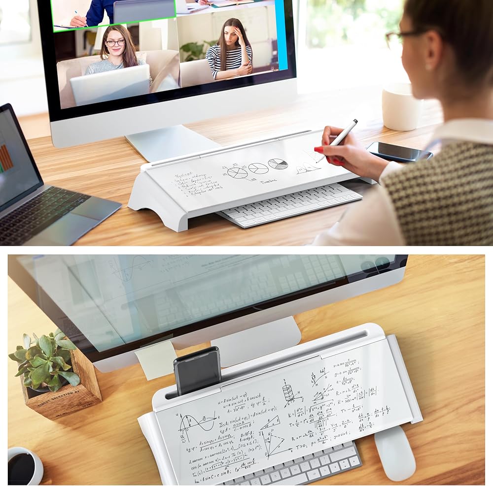 تصميم فعال: يمكنك تحسين مساحة العمل الخاصة بك باستخدام السبورة البيضاء لسطح المكتب، والتي تم تصميمها لتناسب بشكل أنيق بين لوحة المفاتيح والشاشة، وتتميز بزاوية قراءة وكتابة مريحة، أو استخدمها كحامل لوحة مفاتيح.