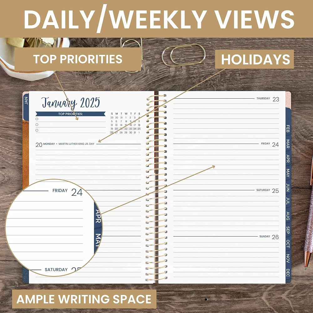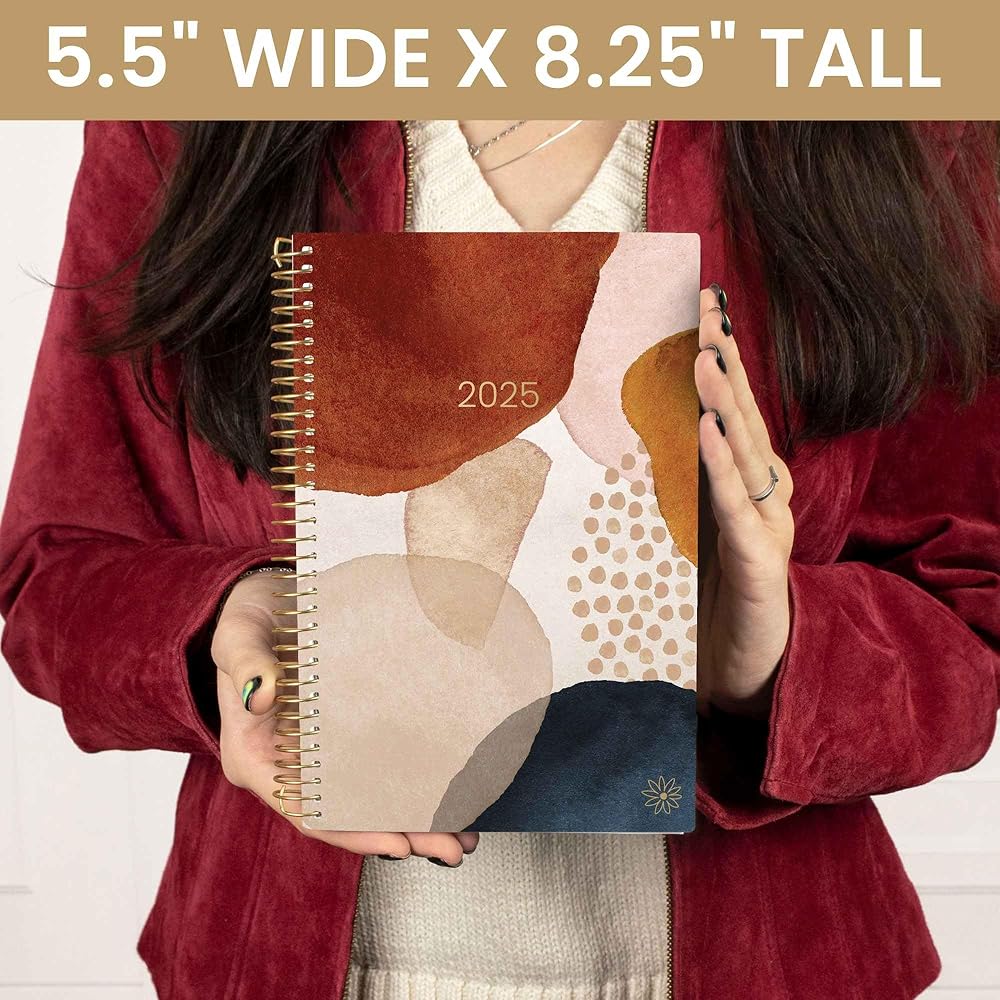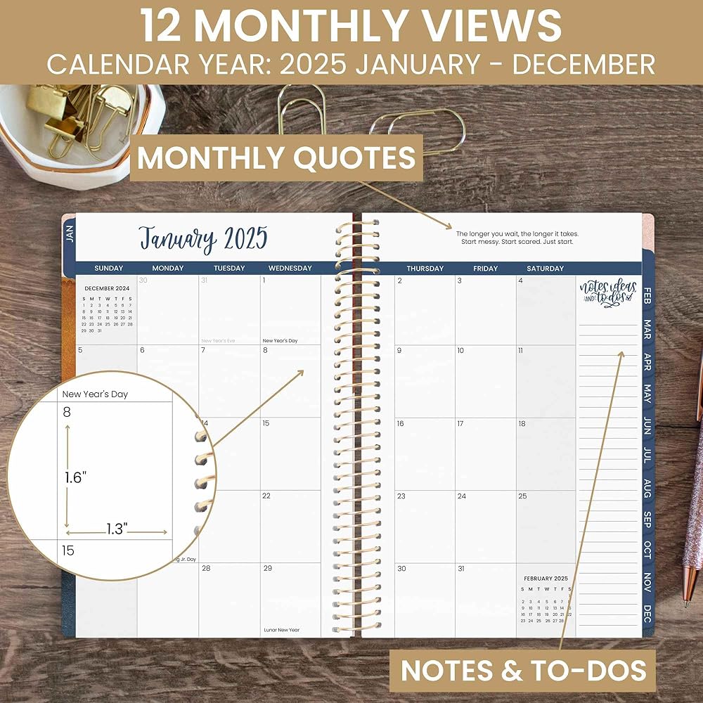 • الأبعاد والتصميم: عرض 5.5 بوصة (بدون ربط) × طول 8.25 بوصة × سمك 0.5 بوصة. محمولة وحجم المحفظة لسهولة النقل. أحجام أصغر وأكبر متاحة! نظرة عامة شهرية مكونة من صفحتين وعروض أسبوعية واسعة تمتد على مدار السنة التقويمية، يناير 2025 حتى ديسمبر 2025 - 365 يومًا!