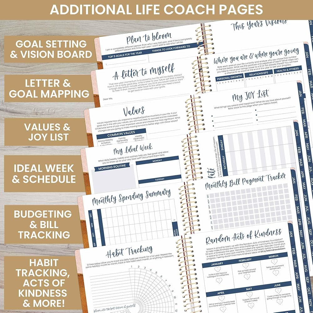 • علاوة: مليئة بأوراق عمل التدريب على الحياة وميزات ملهمة لمساعدتك على تحديد وتحقيق جميع أهدافك لهذا العام: بيان المهمة الشخصية وصفحة تحديد الأهداف السنوية والسريعة، وقوالب الجدولة الأسبوعية، وصفحة القيم، وتتبع العادات، ولوحة الرؤية، وسجل الإنفاق الشهري ، 16 صفحة ملاحظات، اقتباسات ملهمة، تحديات شهرية، والمزيد!