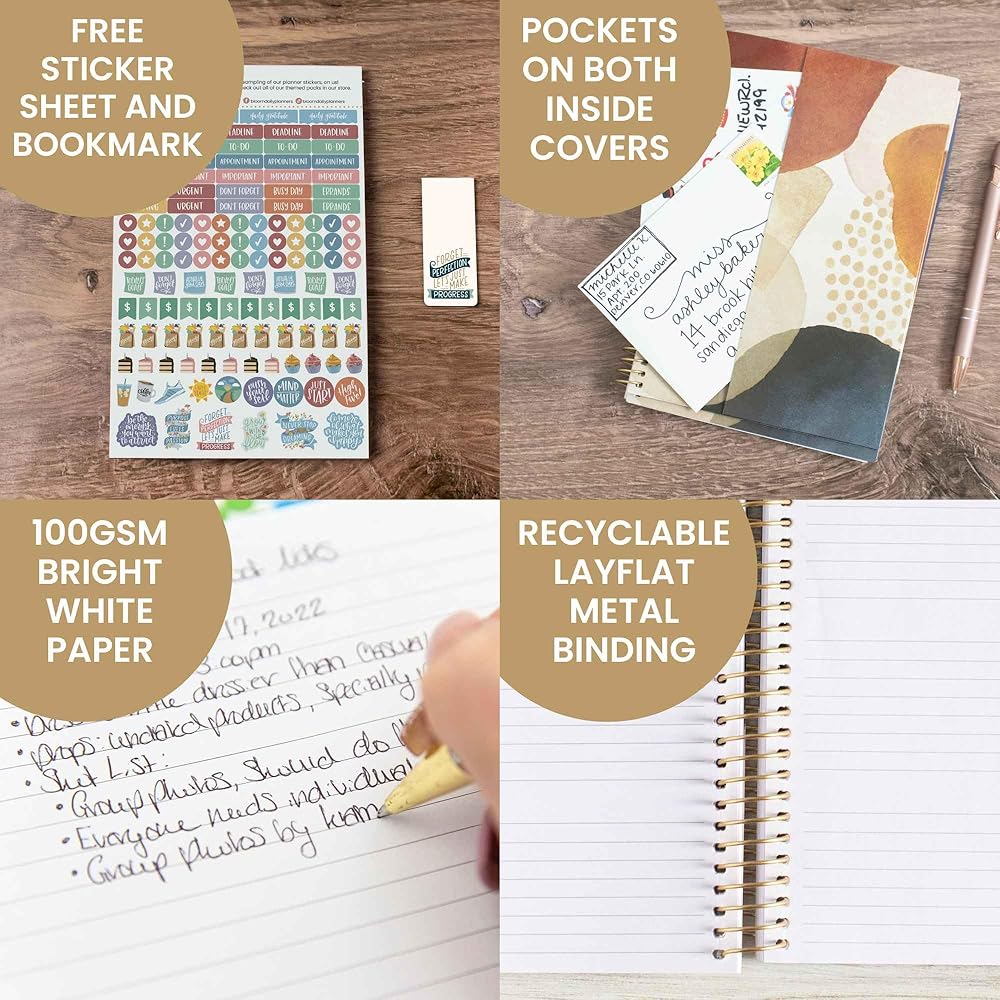 • ميزات فاخرة: أغطية ناعمة وخفيفة الوزن مصنوعة من ورق سميك مع تصفيح لامع، وعروات شهرية، وورق فاخر مقاوم للنزيف باللون الأبيض الساطع 100 جرام لكل متر مربع، ورباط حلزوني مسطح معدني قابل لإعادة التدوير، وجيوب تخزين داخلية أمامية وخلفية، وورقة ملصقات وعلامة مرجعية مجانية !
