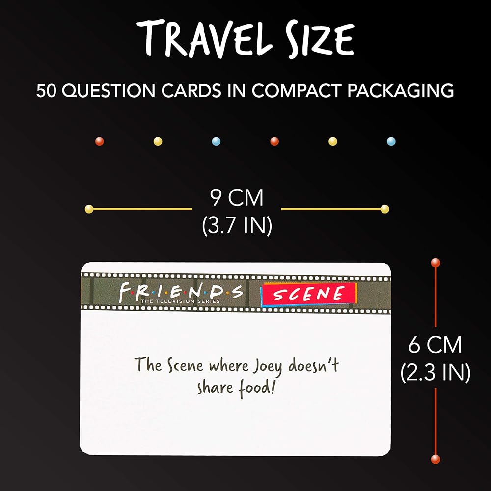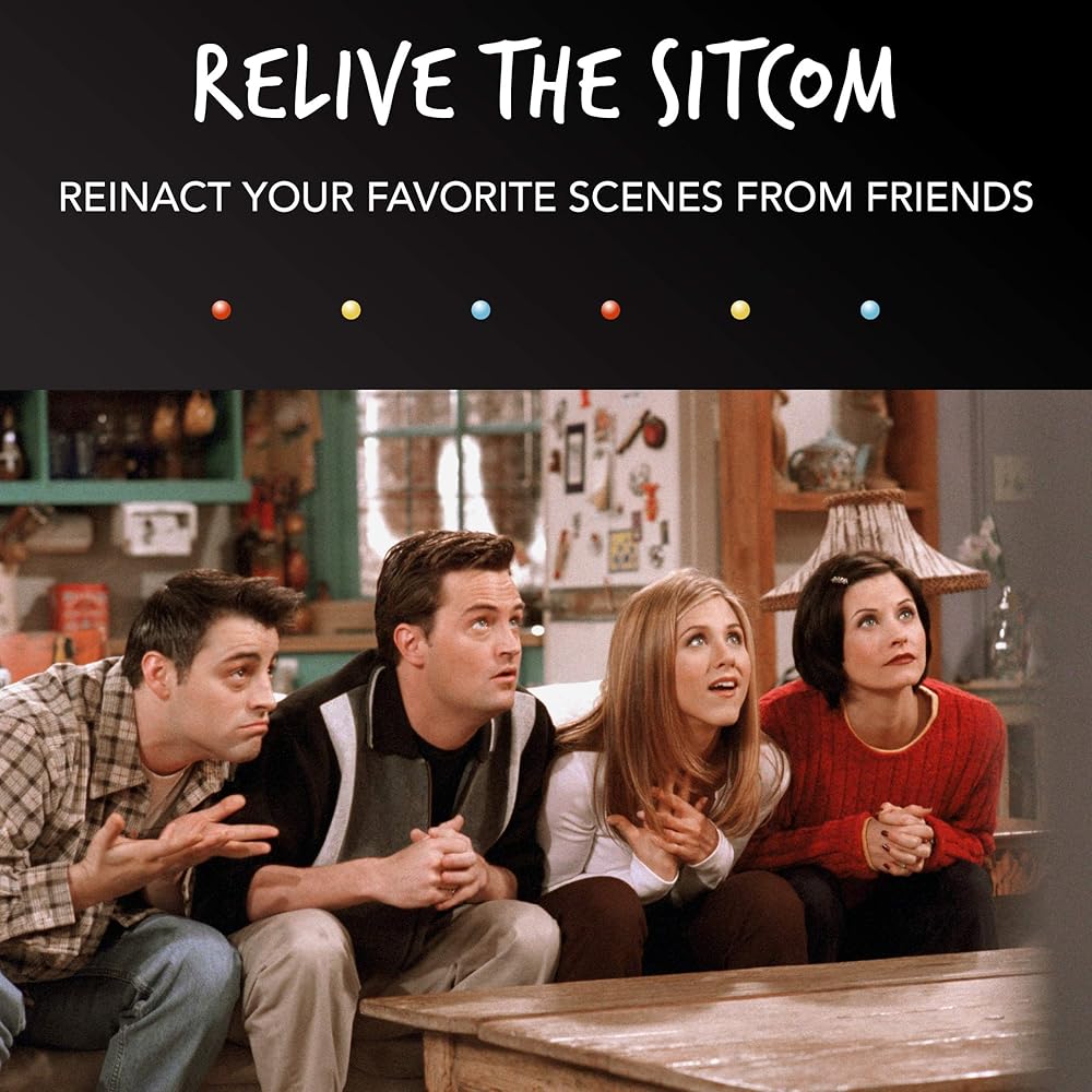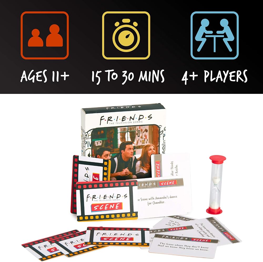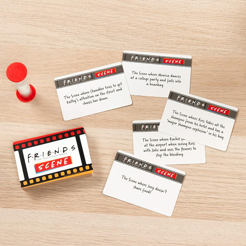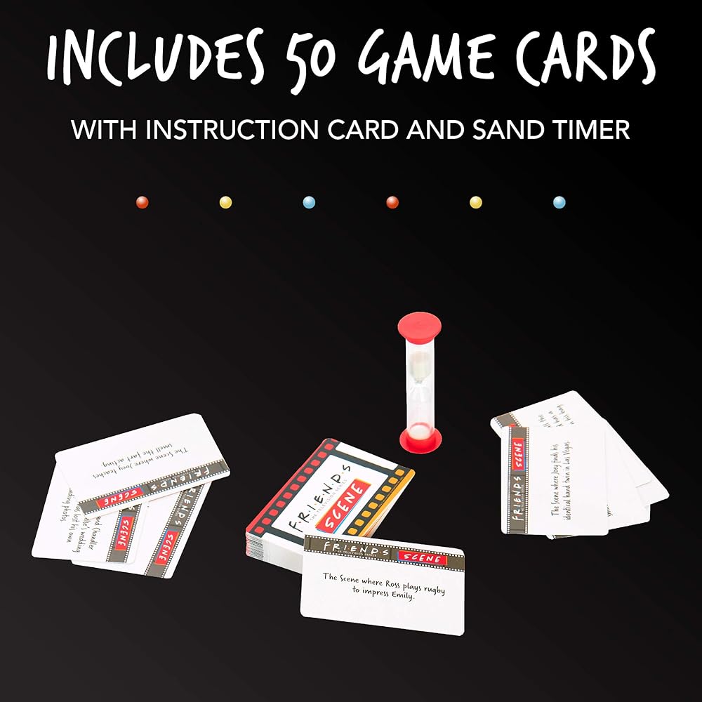 نفذ الأمر: يتكون مشهد الأصدقاء من 50 بطاقة ألعاب كاملة مع بطاقة تعليمات ومؤقت رملي. تصف كل بطاقة مشهدًا من هذه السلسلة الكوميدية الشهيرة للعبة الحزورات الممتعة.