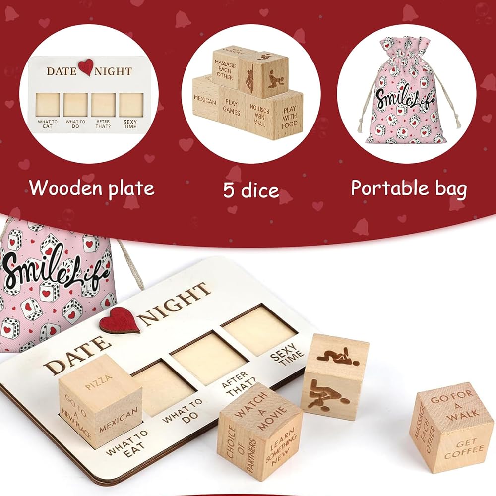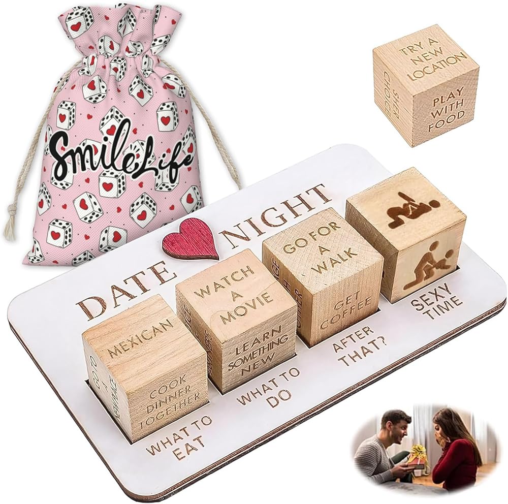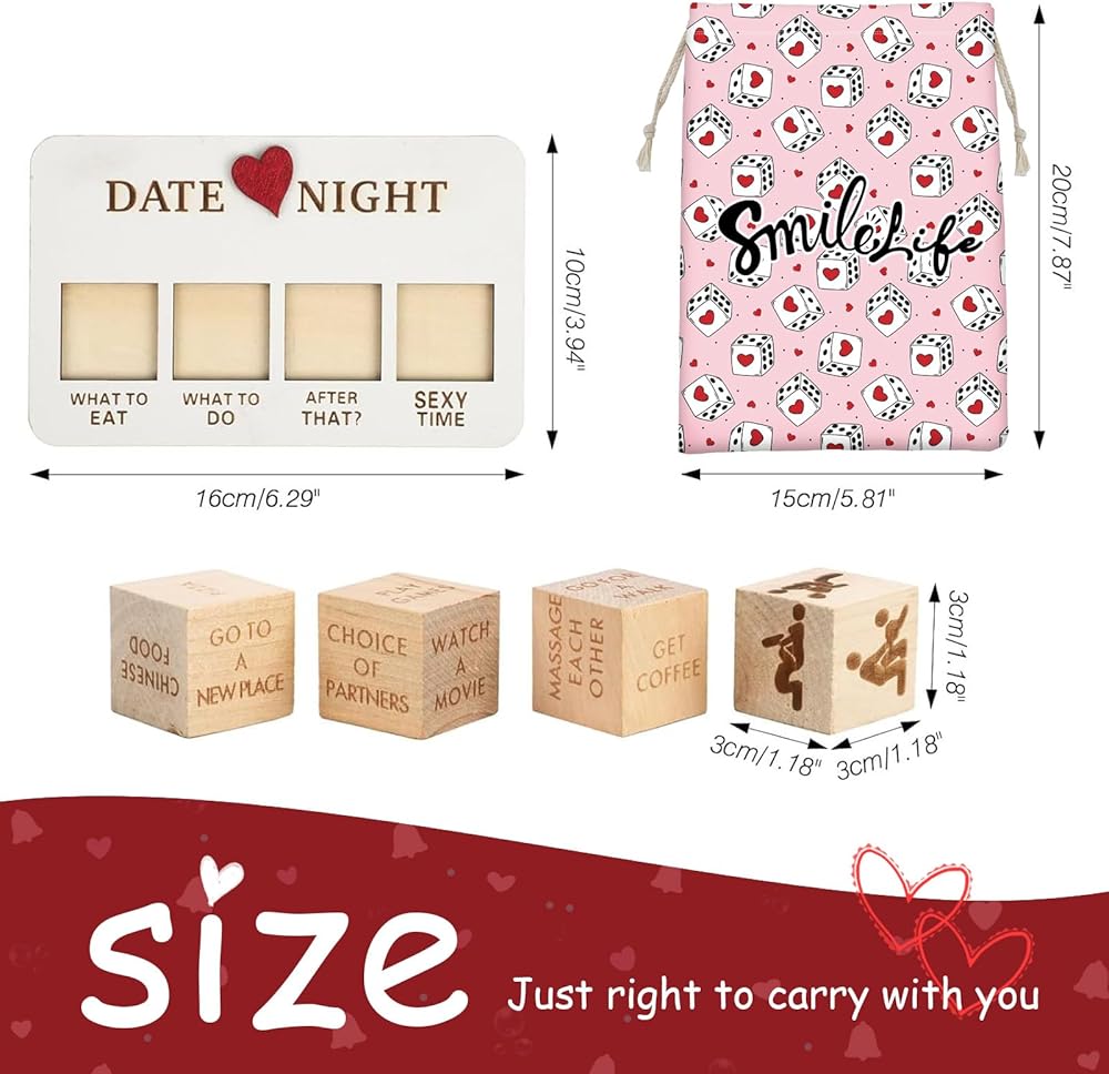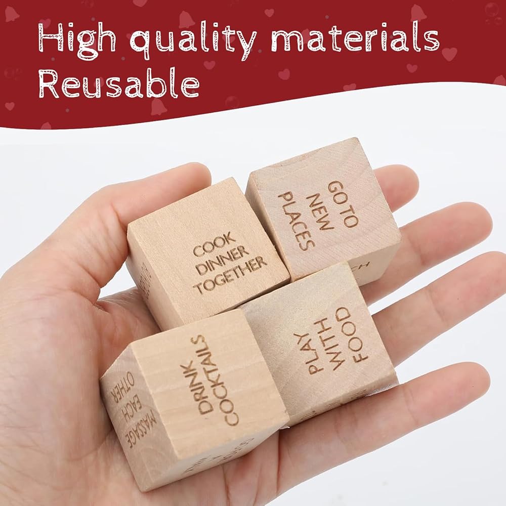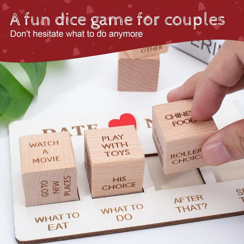 • ♥️【Date Night Dice】If you are struggling to choose a date activity, then this product will be tailor-made for you! The wooden dice has four options for you to choose from: what to eat, what to do, The fun date dice helps you create a romantic and happy night.