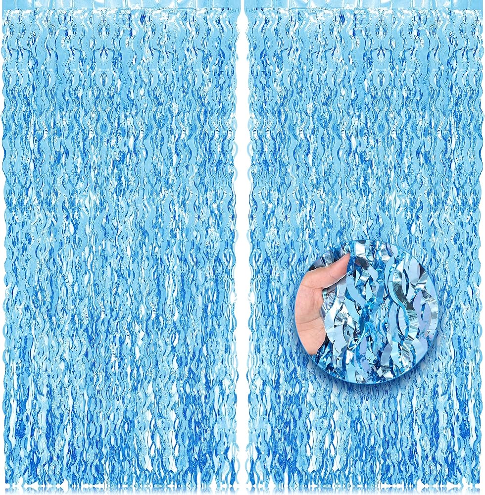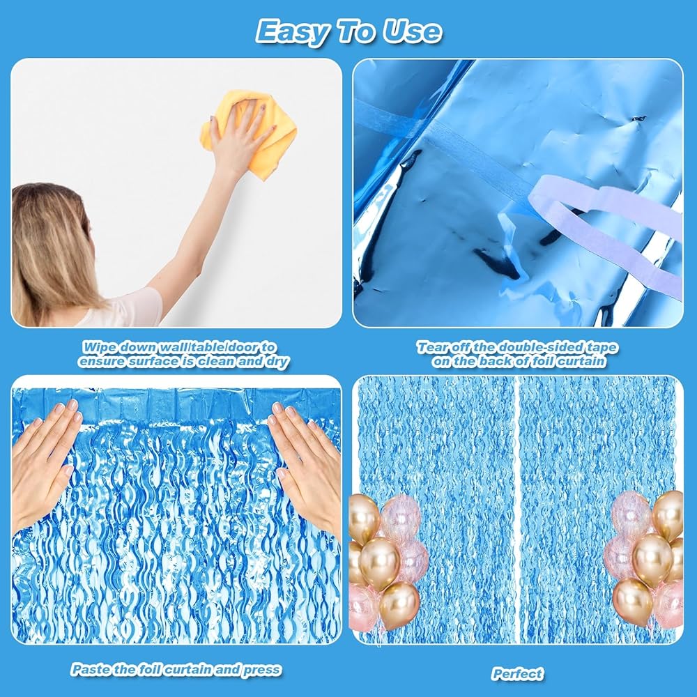 【سهلة الاستخدام】تأتي الستائر المعدنية الأنيقة ذات الشرابة مع شريط لاصق في الخلف لذلك سيكون من السهل جدًا تعليقها على الحائط. يمكنك استخدام الأشرطة الخاصة بك لجعل عصا الشراشيب متينة أو يمكن إزالتها بسهولة للحفلة القادمة. مجموعتان من الستائر ذات الشراشيب الزرقاء المتموجة جنبًا إلى جنب لجعل الخلفية أكبر، أو ضعي طبقة من الستائر المكونة من قطعتين لتحقيق تأثير أكثر سمكًا وكثافة. من المؤكد أن الجميع سيحبون التقاط صور سيلفي أمام هذه الخلفية الصيفية. مثالية تحت ديكورات البحر للحفلات