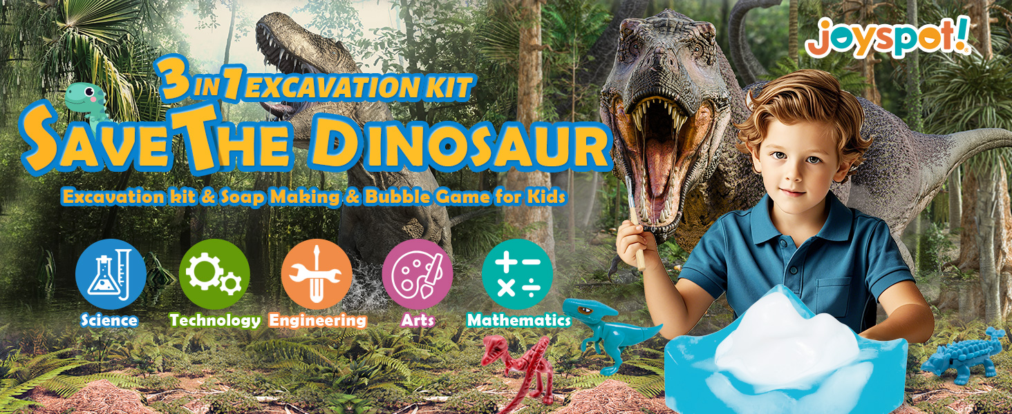 يصنع ما يصل إلى 4 صابون على شكل ديناصور: يمكن للأطفال تحويل بقايا الصابون إلى حالة سائلة عن طريق تسخينها في الماء الساخن أو فرن الميكروويف، ثم صب الخليط في قوالب. بمجرد أن يبرد الصابون، سيكون لديهم صابون جديد لاستخدامه. لإضفاء لمسة غريبة على الصابون الخاص بهم، يمكنهم إضافة عطر الورد أو الأصباغ إلى قاعدة الصابون. إشراف الكبار ضروري عندما يشارك الأطفال في صنع الصابون. يمكن للأطفال استخدام الصابون الناتج لغسل اليدين