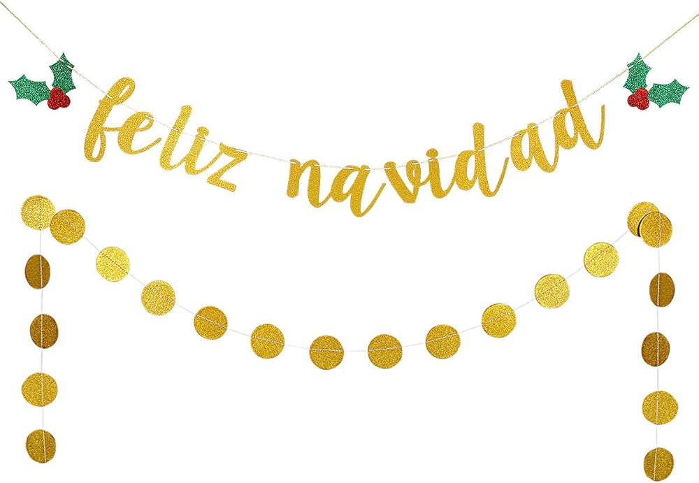 • لافتة Feliz navidad: ورق لامع عالي الجودة صديق للبيئة، طول الحرف تقريبًا 13-17 سم. قطر إكليل النقاط الدائرية الذهبية اللامعة: 2 بوصة، إجمالي 25 قطعة من النقاط الدائرية. تحتاج إلى التجميع بنفسك، القليل من الأعمال اليدوية.